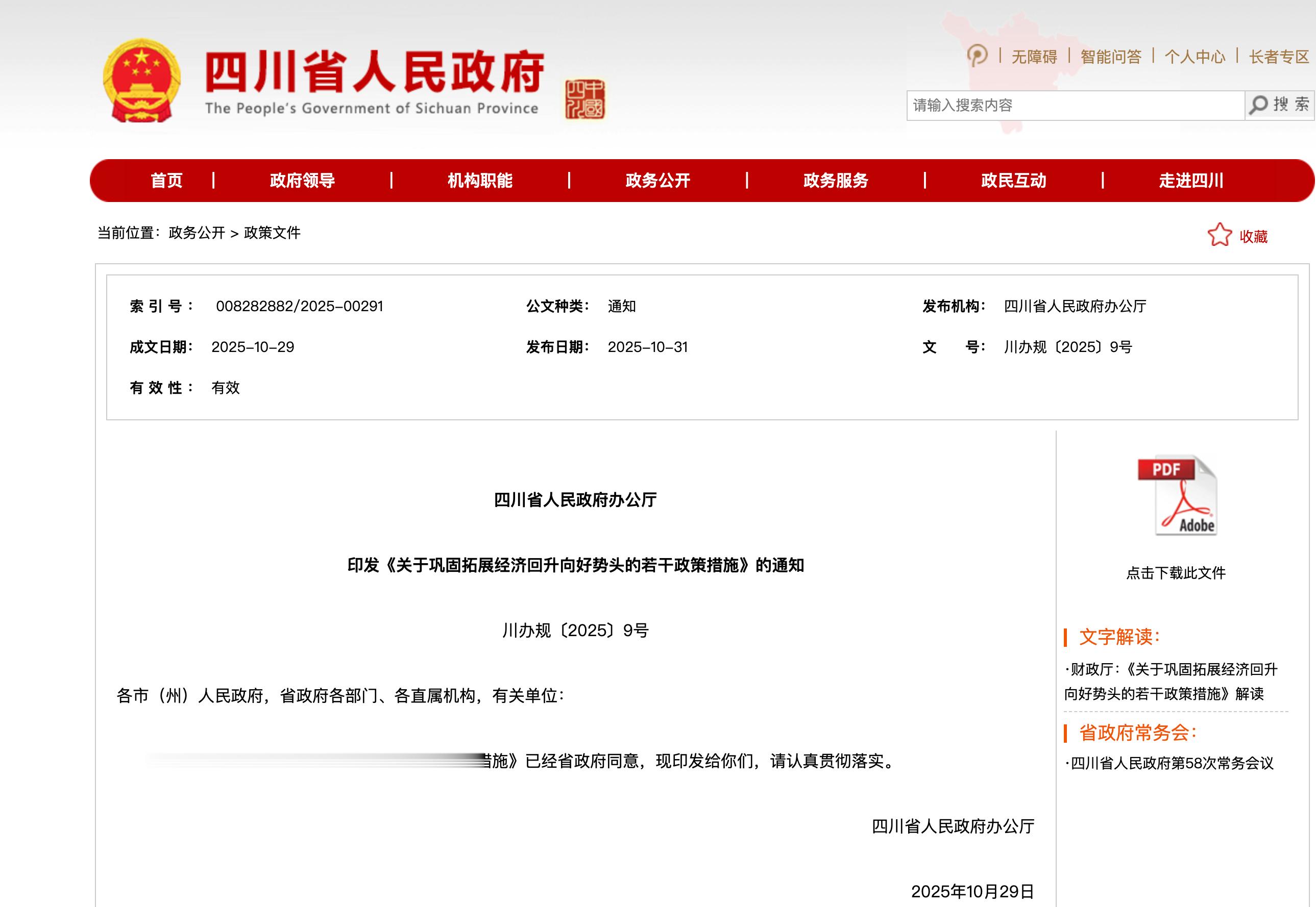 在消费提振方面,四川将从实施消费新场景运营激励、支持房地产市场平稳健康发展、发放“蜀里安逸”消费券、实施个人消费贷款贴息、实施二手车销售奖励等5个方向发力。如对2025年10月1日至2026年3月31日期间,围绕增加消费高品质供给,举办“消费+”多元融合的消费促进活动,营业收入较上年同期增长6%以上且2025年营业收入超过2000万元,符合条件的“蜀里安逸”消费新场景运营主体,省级财政按其消费促进活动实际投入的50%给予补助,单户企业最高100万元。
