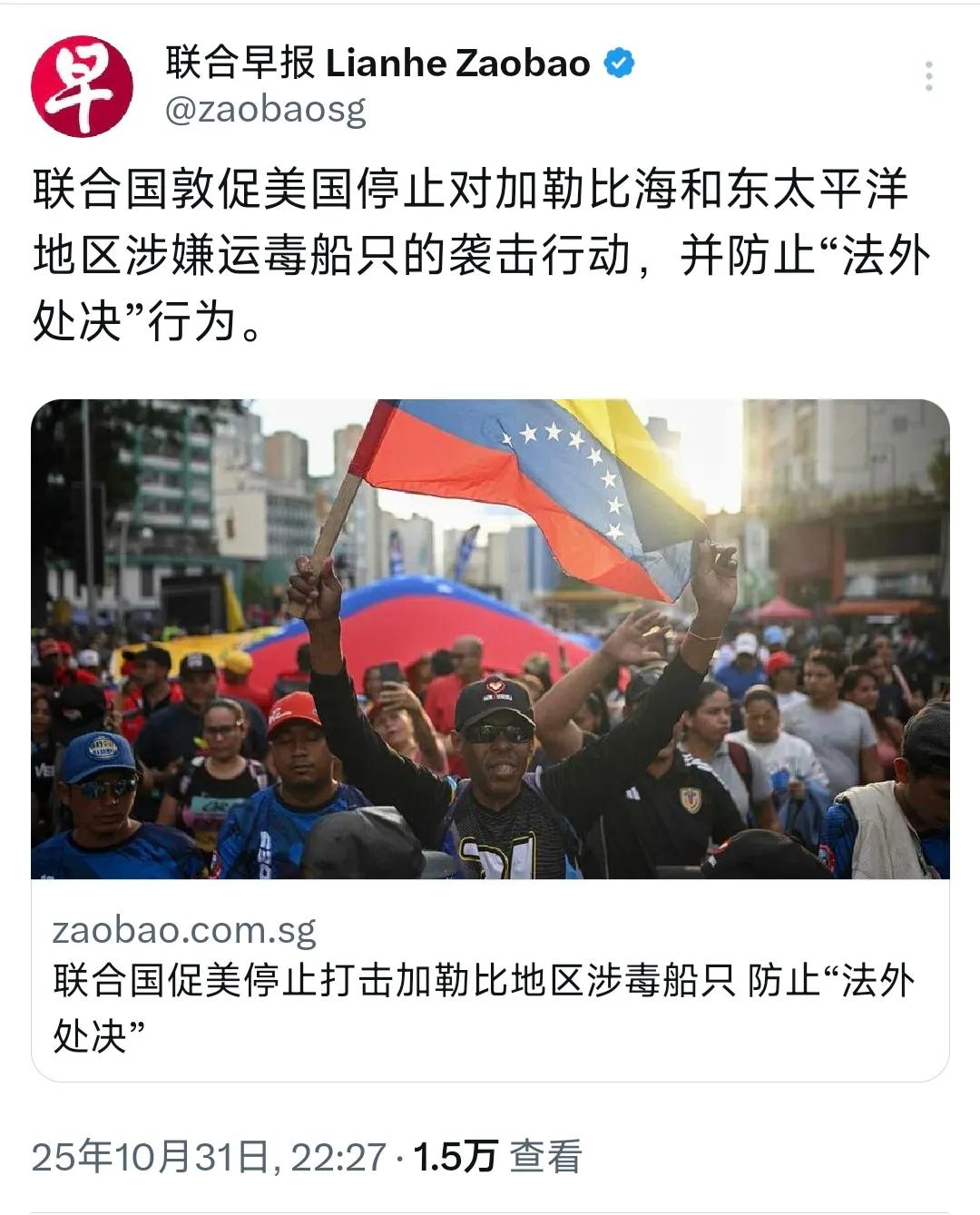 来自外媒10月31日消息说,联合国敦促美国停止对加勒比海等地区涉嫌运送毒品船只的袭击。 消息强调,这是防止法外处决行为。 事实上,美国以制止毒品运送为借口,在那一带海域采取行动,造成了不少人员伤亡。这样的情况,显然已经引起了国际社会不满。但是对于联合国的警告,美国根本置之不理。美国既不缴纳联合国会费,又不遵守联合国的要求,以实际行动体现了凌驾于联合国规则之上的情况。 现在的联合国势弱,对此确实没有什么办法的。