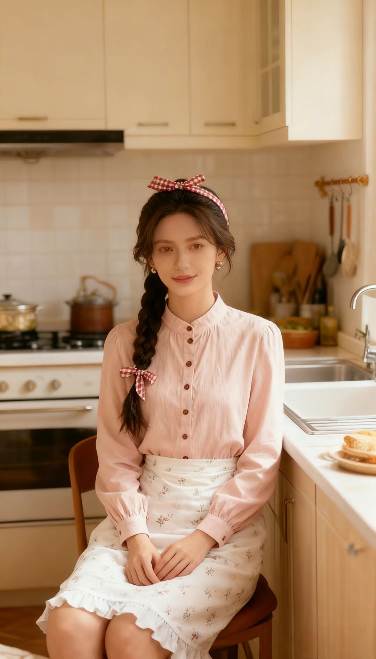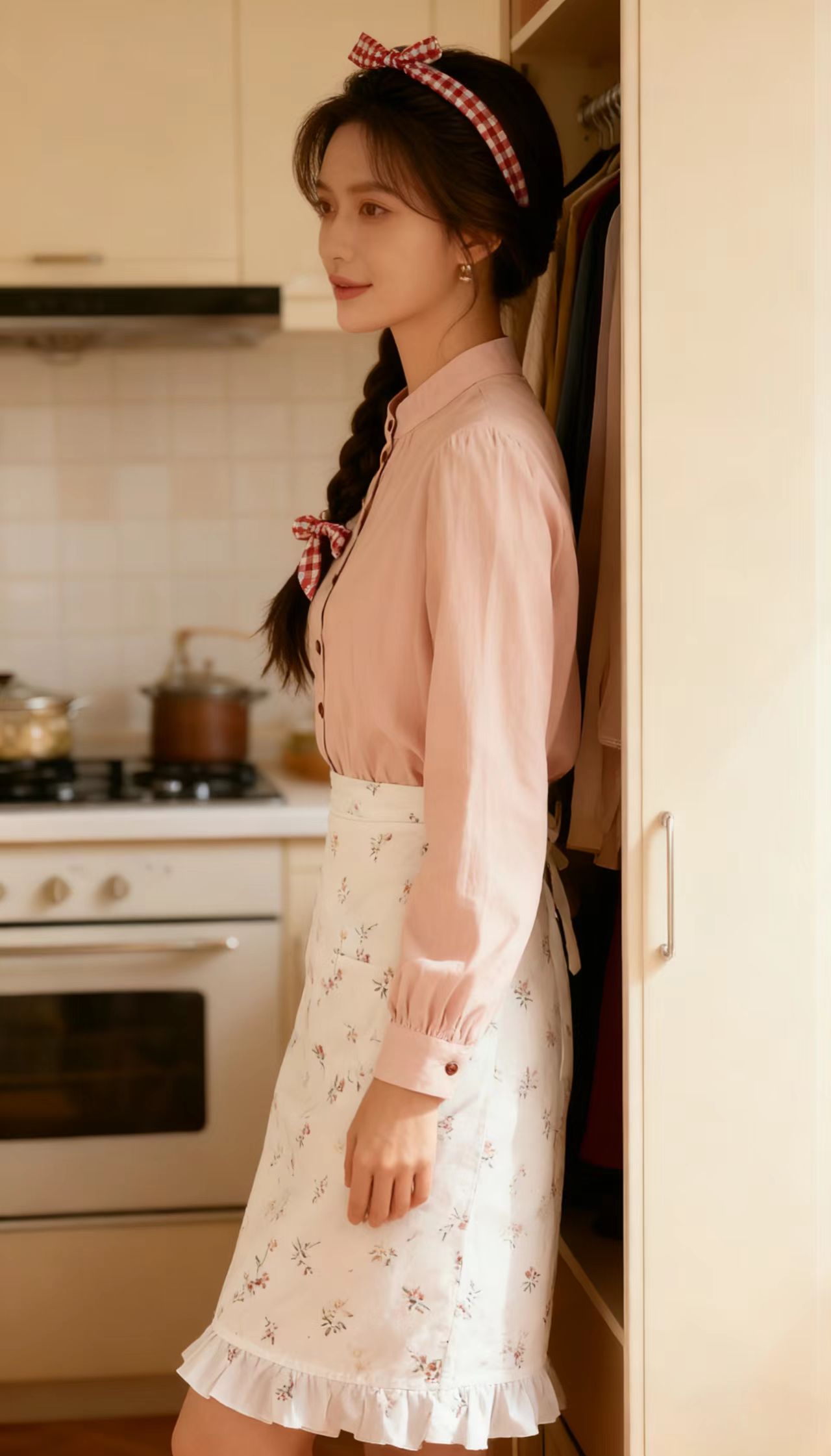 浅粉色衬衫搭配围裙式的短裙,小姐姐的穿搭创意新颖。