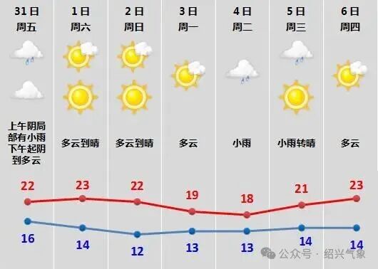11月初,绍兴区域内天气以多云到晴为主,光照条件较好,气温波动相对平缓,适宜开展户外活动及日常生产生活,也利于衣物晾晒等日常事务安排。周末市民朋友们也可以选择出门秋游,赏桂散心~