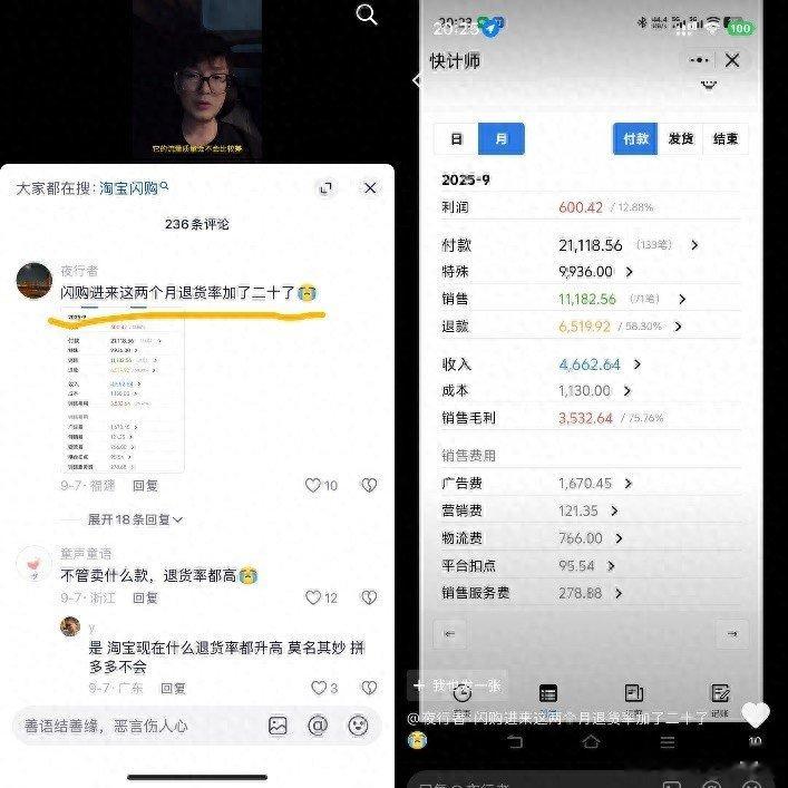 更有商家经过统计发现,点击量增加的同时转化率变化不大,反而退货率飙升,“闪购进来这两个月退货率加了二十了,没看到外卖转化,只看到羊毛党”,尤其是8月开始退款变多。有人调侃,外卖大战最大受害者实则是深受背刺的老电商人。