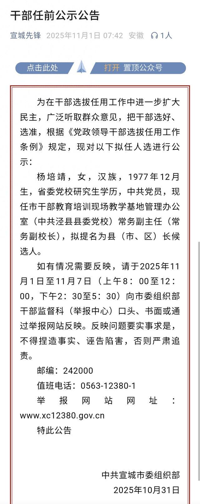 杨培靖,女,汉族,1977年12月生,省委党校研究生学历,中共党员,现任市干部教育培训现场教学基地管理办公室(中共泾县县委党校)常务副主任(常务副校长),拟提名为县(市、区)长候选人。