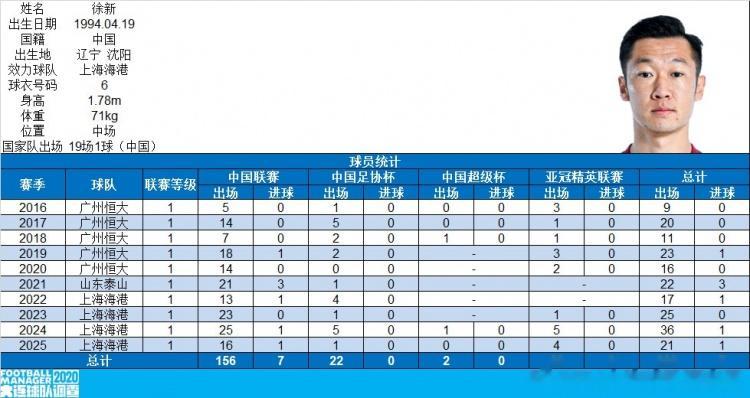 直播吧11月1日讯中超联赛第29轮,上海海港主场3-0击败浙江队。据博主“FM大连球队调查员”统计,海港球员徐新完成代表中国俱乐部各项职业赛事出场200场,总共打入7球。