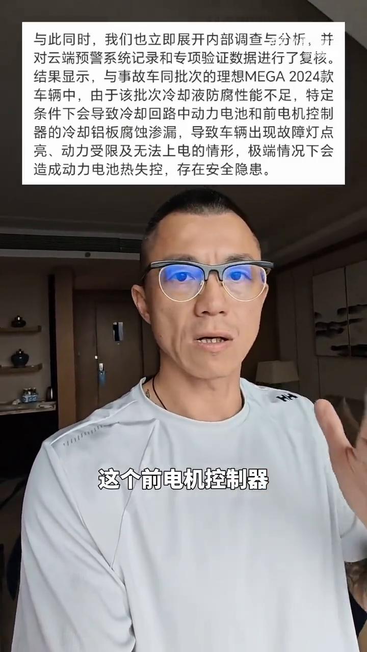 关于理想MEGA召回这个事,有很多同学在私信还有在评论里就问我,说这到底是电池本身的原因吗?因为大家都知道理想MEGA所用的电池是宁德时代的麒麟5C电池。后来我也认真做了一下功课,包括去研究了一下理想MEGA发布的官方的通告,应该是可以确定就不是电池或者是电芯本身的问题。 宁德时代麒麟5C电池本身是没有问题的,因为它也是在其他的一些车型上去被广泛使用的,也都没有一些什么相关的召回或者报道或者是隐患,所以在这方面大家不用担心。 我也关注了理想的通告的一些细节,主要召回的原因是因为所采用的电池冷却液在回路那边,因为冷却液的抗腐蚀性不达标,冷却液冻伤的一些原因导致了前电机控制器和电池之间的铝板被冷却液给腐蚀,导致了渗漏,导致了热管理的失控,所以这个跟电池本身是没有关系的,大家完全不用操心这个事。 当然了,我也是基于现有的这些已经披露出来的信息进行的推测,在理想MEGA的那份通告里也明确的有所提到,宁德时代麒麟5C的电池是没有任何问题的。所以基于所有的这些信息,我做出了一个这样的推测。 更多的细节,我觉得大家可以去关注一下宁德时代那边的通报以及理想那边更详细的通报。
