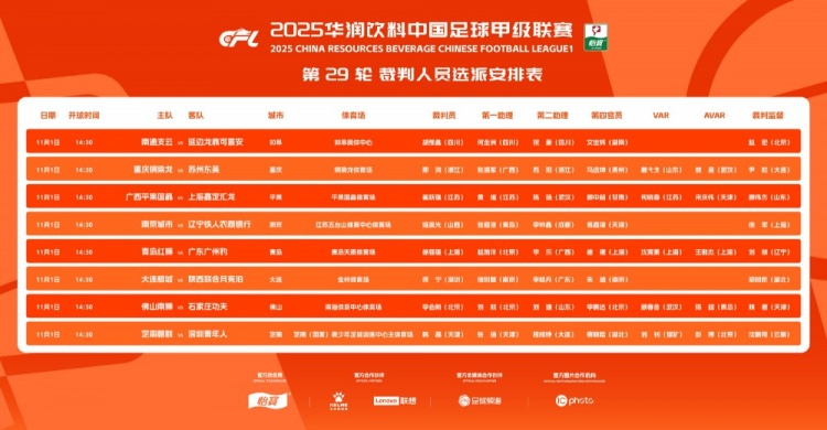 直播吧11月1日讯今天下午14:30,2025赛季中甲联赛第29轮8场同开,中甲联赛官方公布了执法裁判名单,其中5场比赛设有VAR。