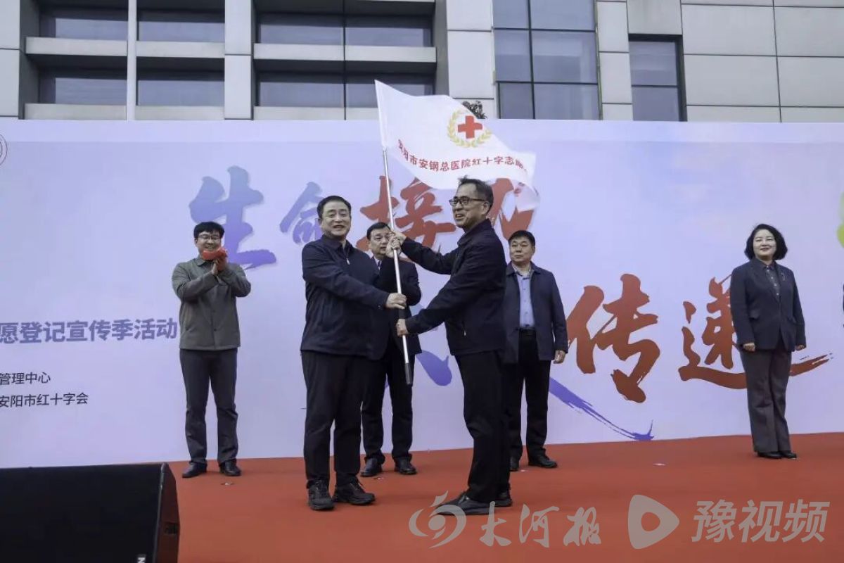 焦亚军向安钢总医院授志愿服务队旗帜,这面旗帜不仅是一份荣誉,更是一份沉甸甸的责任,标志着医院在人体器官捐献志愿服务领域迈出了新的步伐。