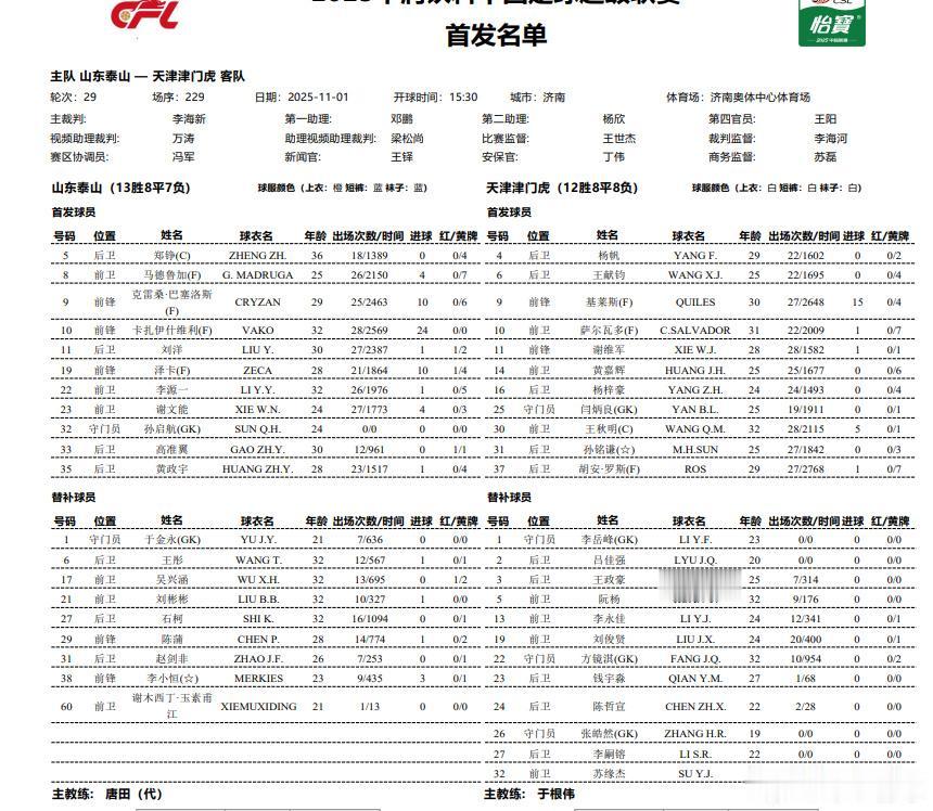 虎扑11月01日讯北京时间今天15:30,山东泰山即将在主场迎战天津津门虎,赛前双方公布首发名单。