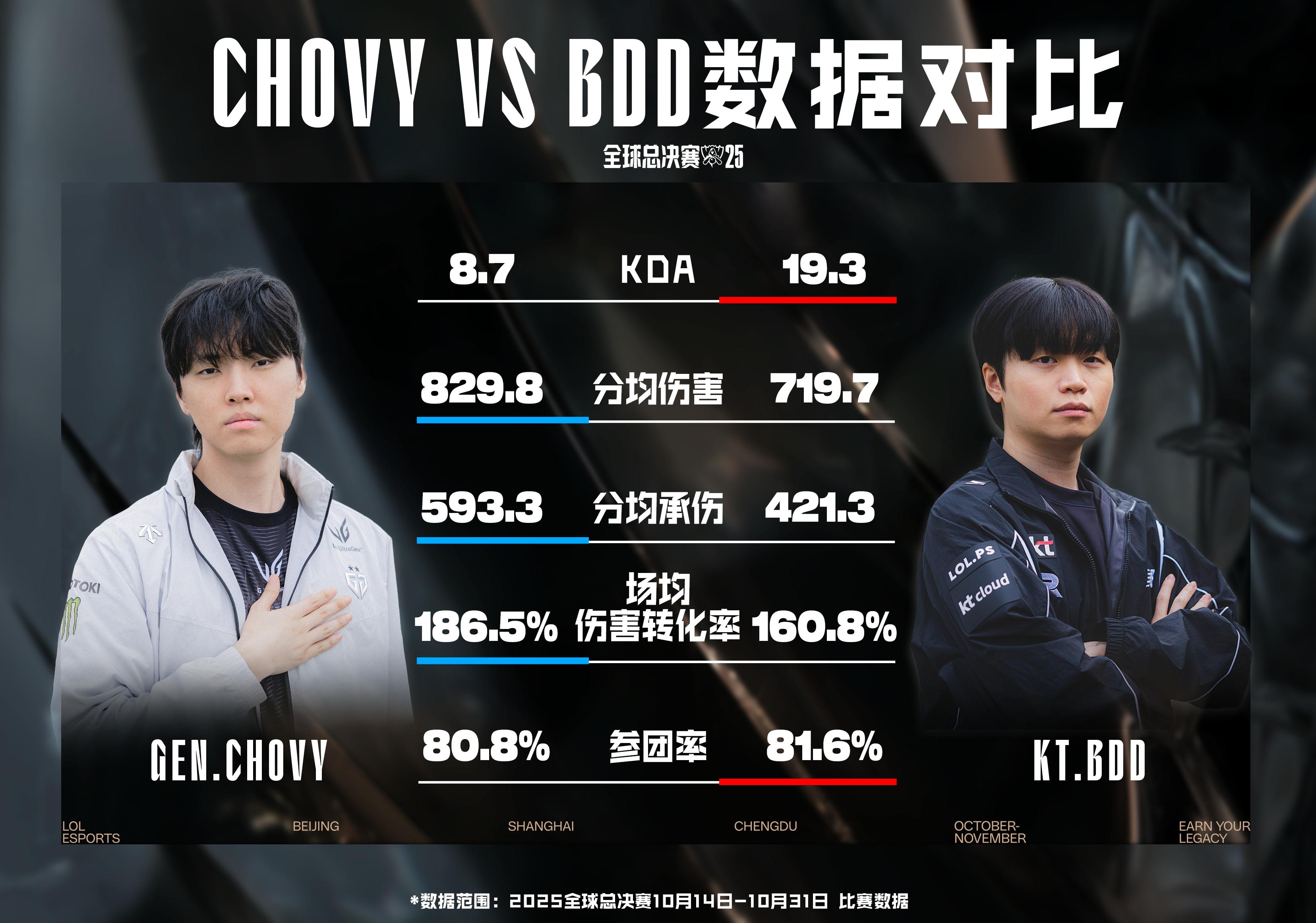 Chovy对战Bdd数据对比:Chovy以829.8的分均伤害+593.3的分均承伤+186.5%的场均伤害转化率领先;而Bdd凭借19.3的KDA+81.6%的参团率领先。