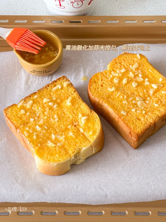 ▫️黄油融化加蒜末搅匀,刷在吐司上