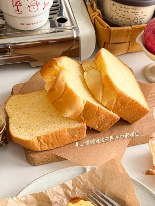 空口吃有淡淡的甜味,松软中又带点嚼劲,完全不会干噎,黄油香气很足,早上直接来两片也很满足了