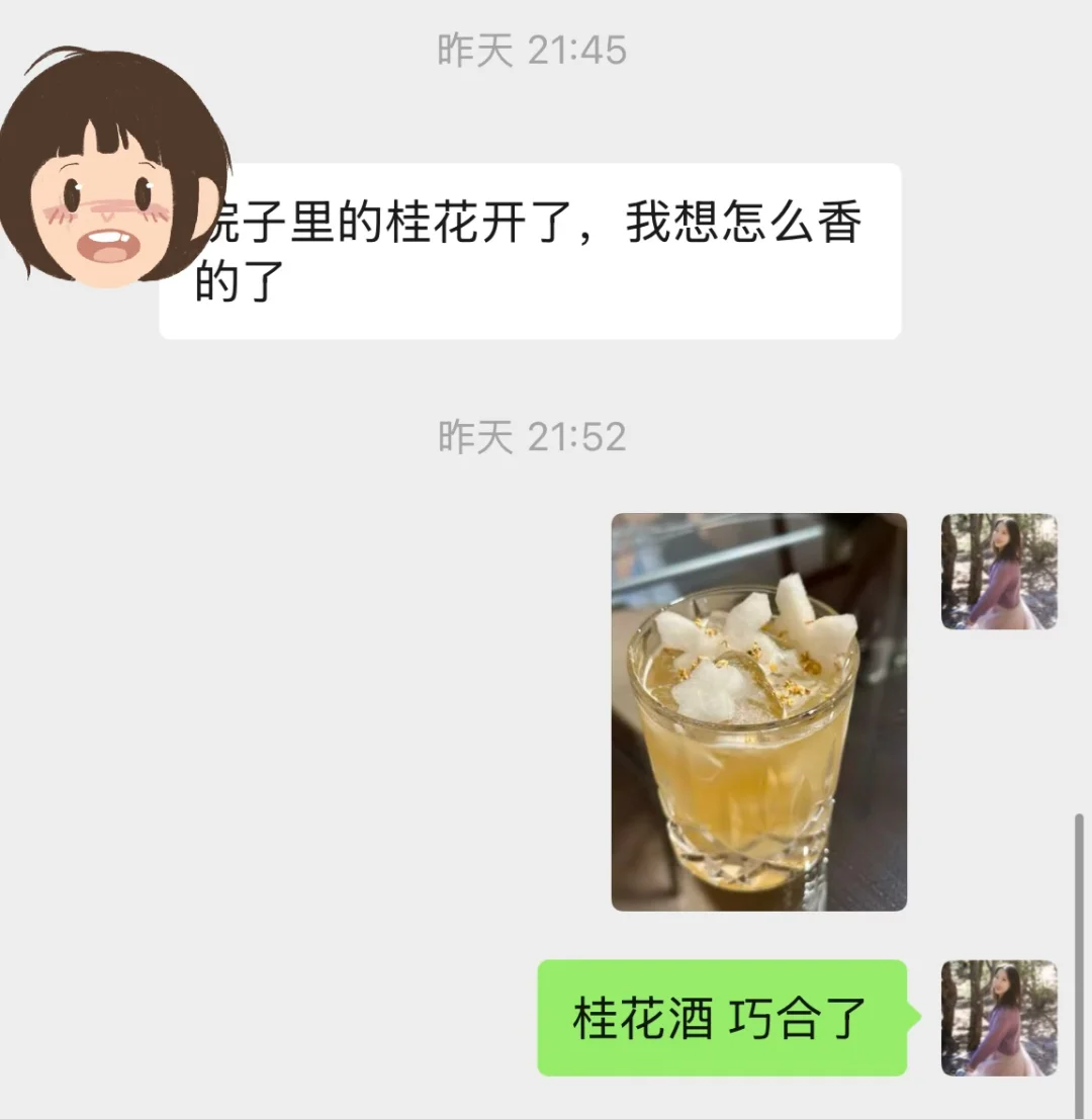 更巧合的是,之前一直听妈妈念叨,今年天气很反常,估计桂花开不了了。结果在我和男友美美品尝桂花酒的时候,妈妈发来消息说,不知怎么觉得好香,一看发现院子里桂花开了☺️感受到了奇妙的共振,又闷闷的有点想家,但又觉得甜甜的有些安慰。