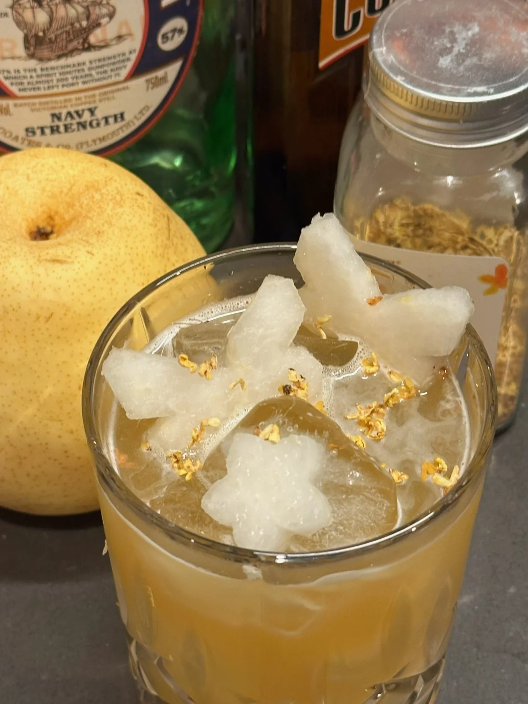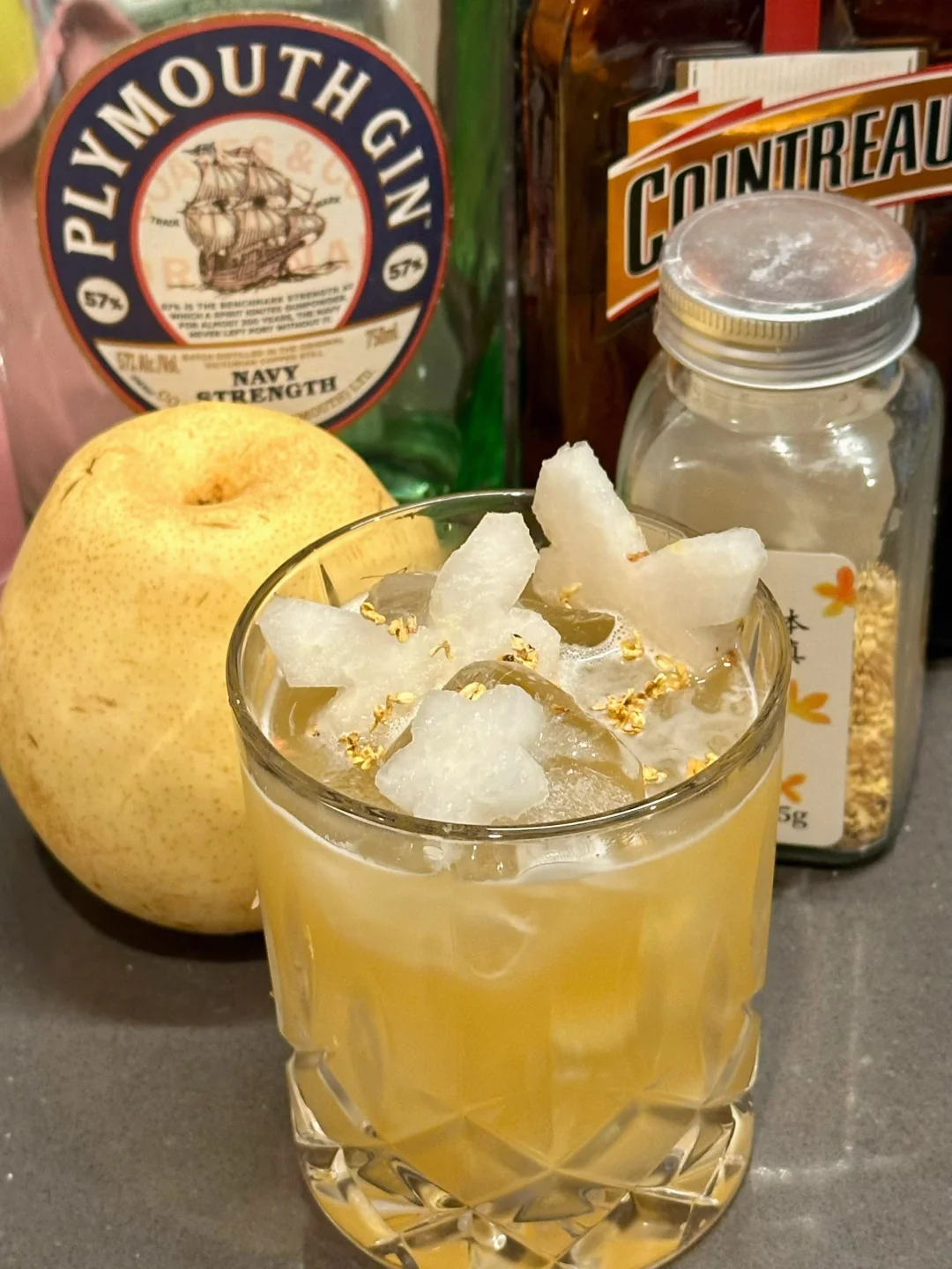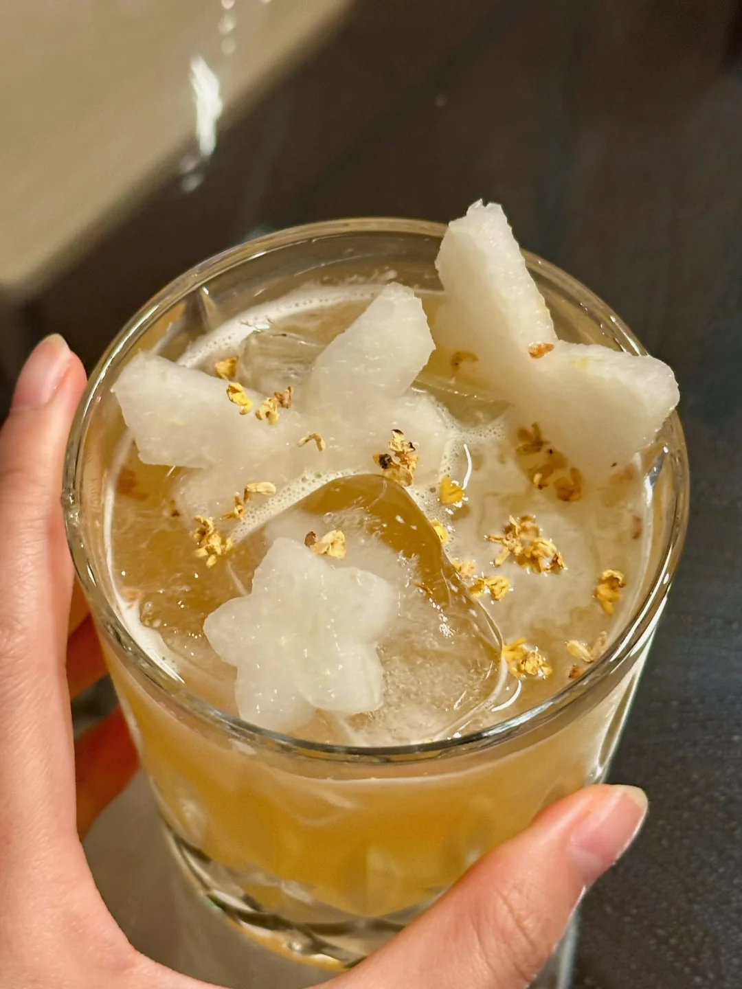 长时间浸泡桂花后的金酒,看起来真的像亮晶晶的碎金子,而且芳香物质全都被萃取进去了,那一口香味,比好多桂花调的香氛还正!搭配了鲜梨汁和枫糖浆,甘洌清甜,温润柔和,融为一体不分彼此,就是我想象中“桂花”味道的实感。