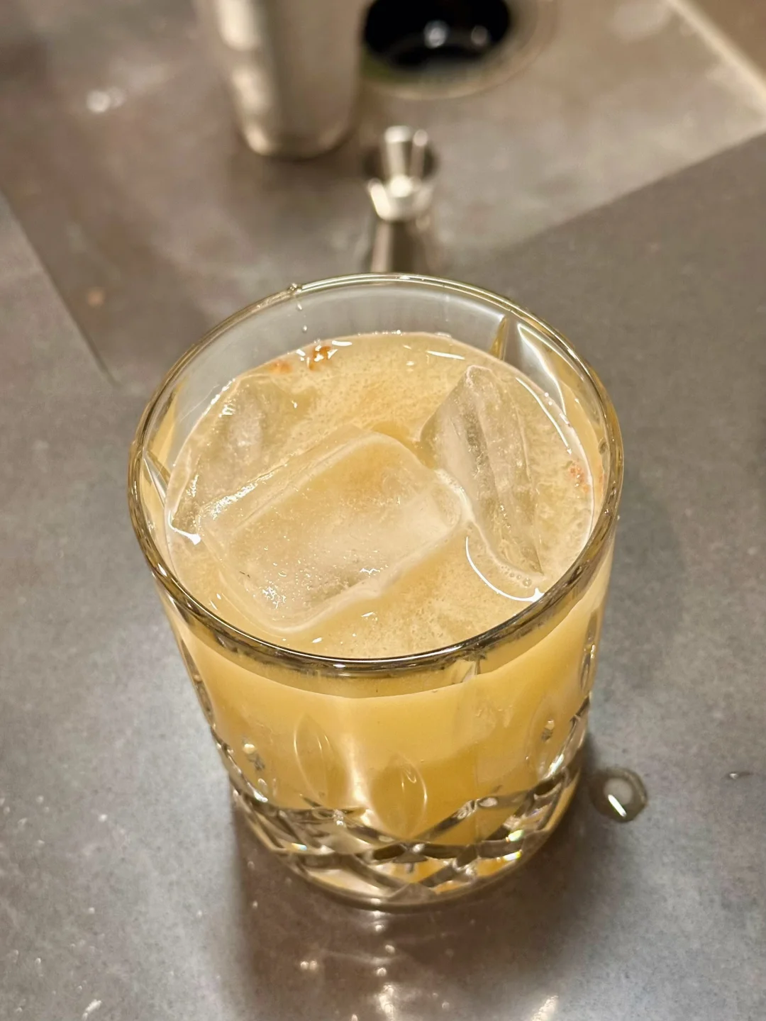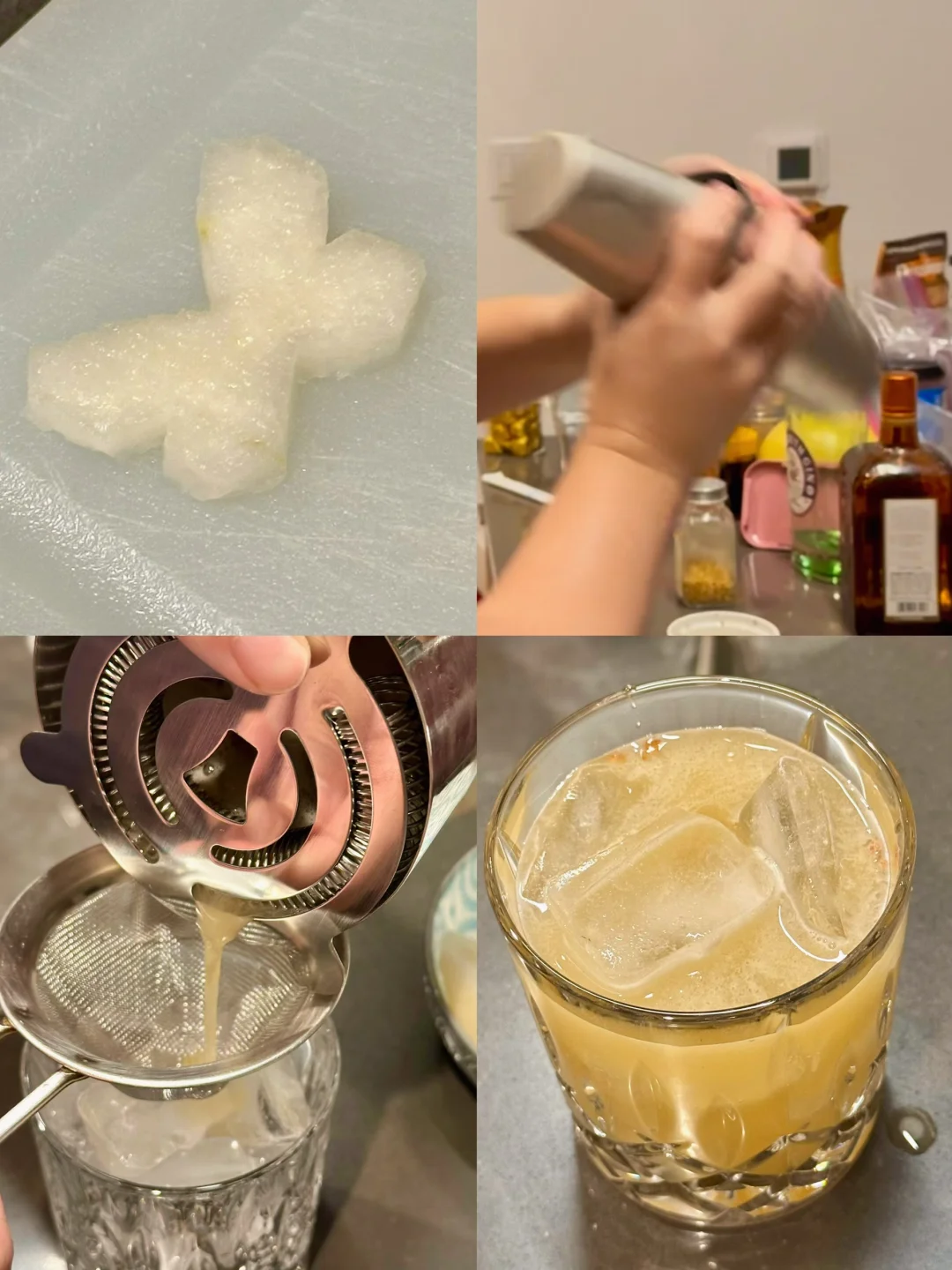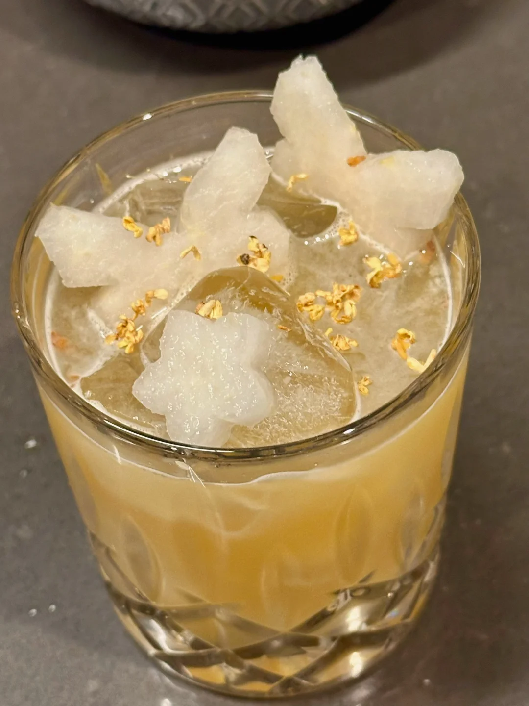 长时间浸泡桂花后的金酒,看起来真的像亮晶晶的碎金子,而且芳香物质全都被萃取进去了,那一口香味,比好多桂花调的香氛还正!搭配了鲜梨汁和枫糖浆,甘洌清甜,温润柔和,融为一体不分彼此,就是我想象中“桂花”味道的实感。