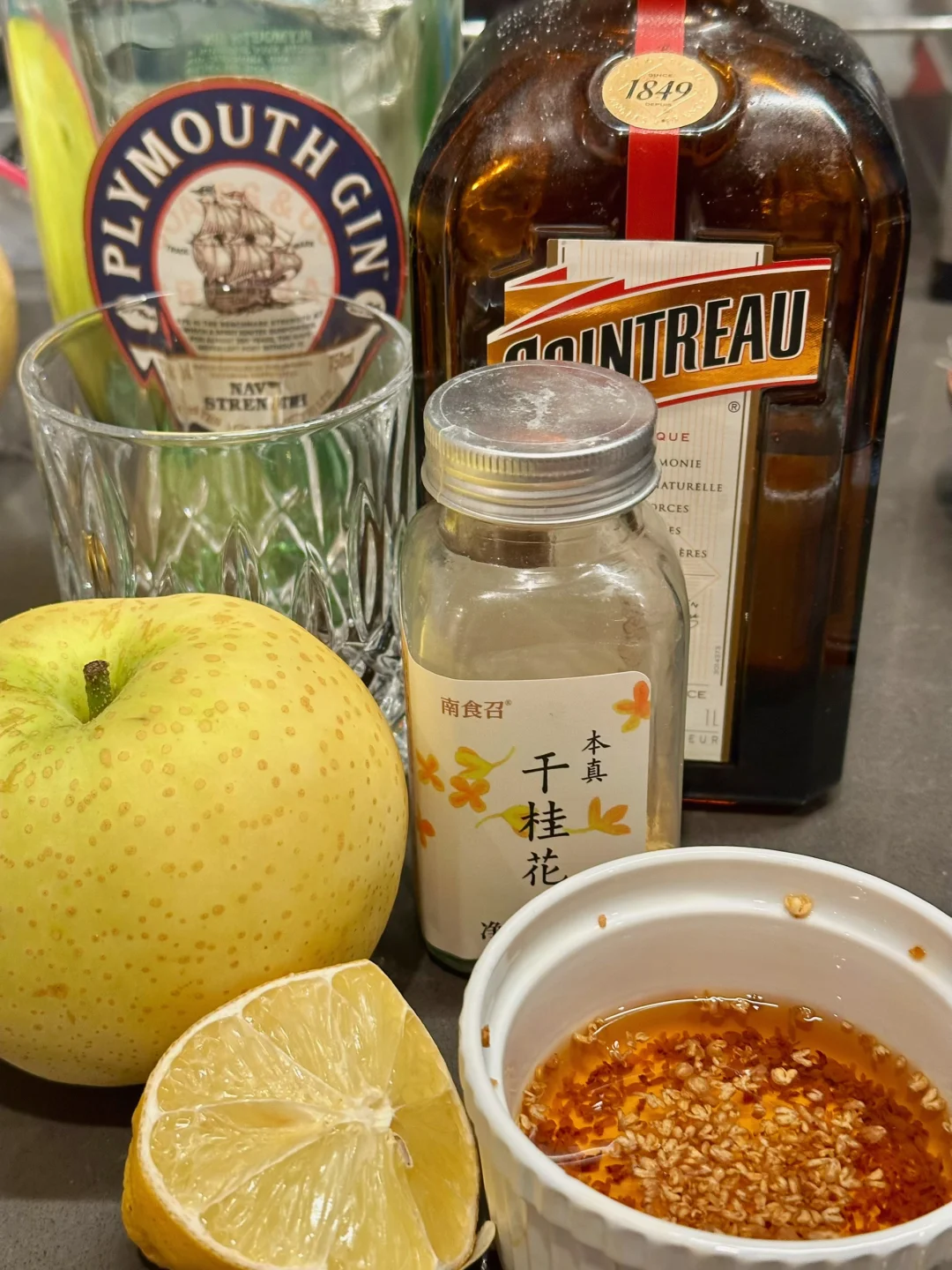金酒Gin40ml,桂花适量,梨子一块,Cointreau酒10ml,枫糖浆10ml,冰块适量。