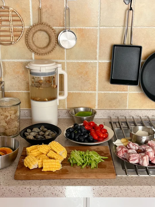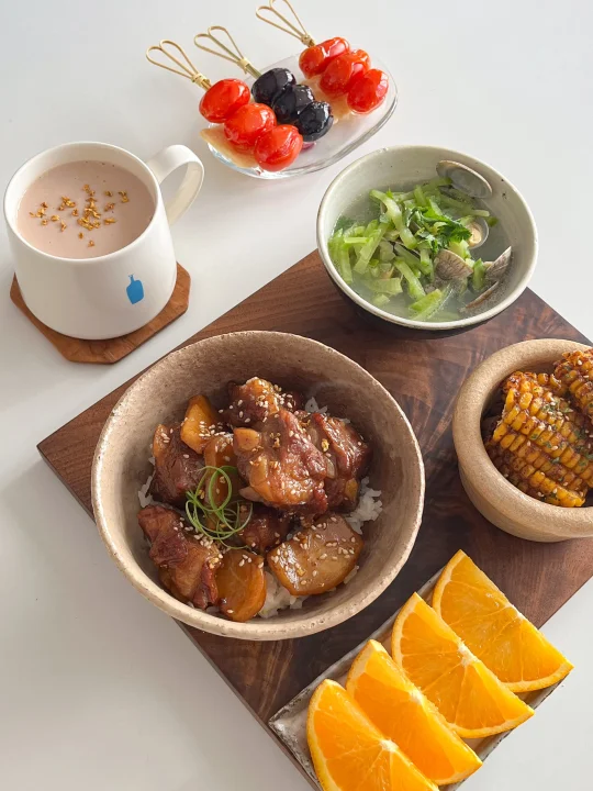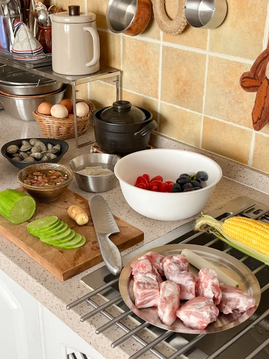 今天的饭: 年糕可乐排骨🍖 青萝卜丝花甲汤🥣 沙茶酱烤玉米🌽 奶皮子糖葫芦🍡 花生核桃露🥜 手掰橙🍊