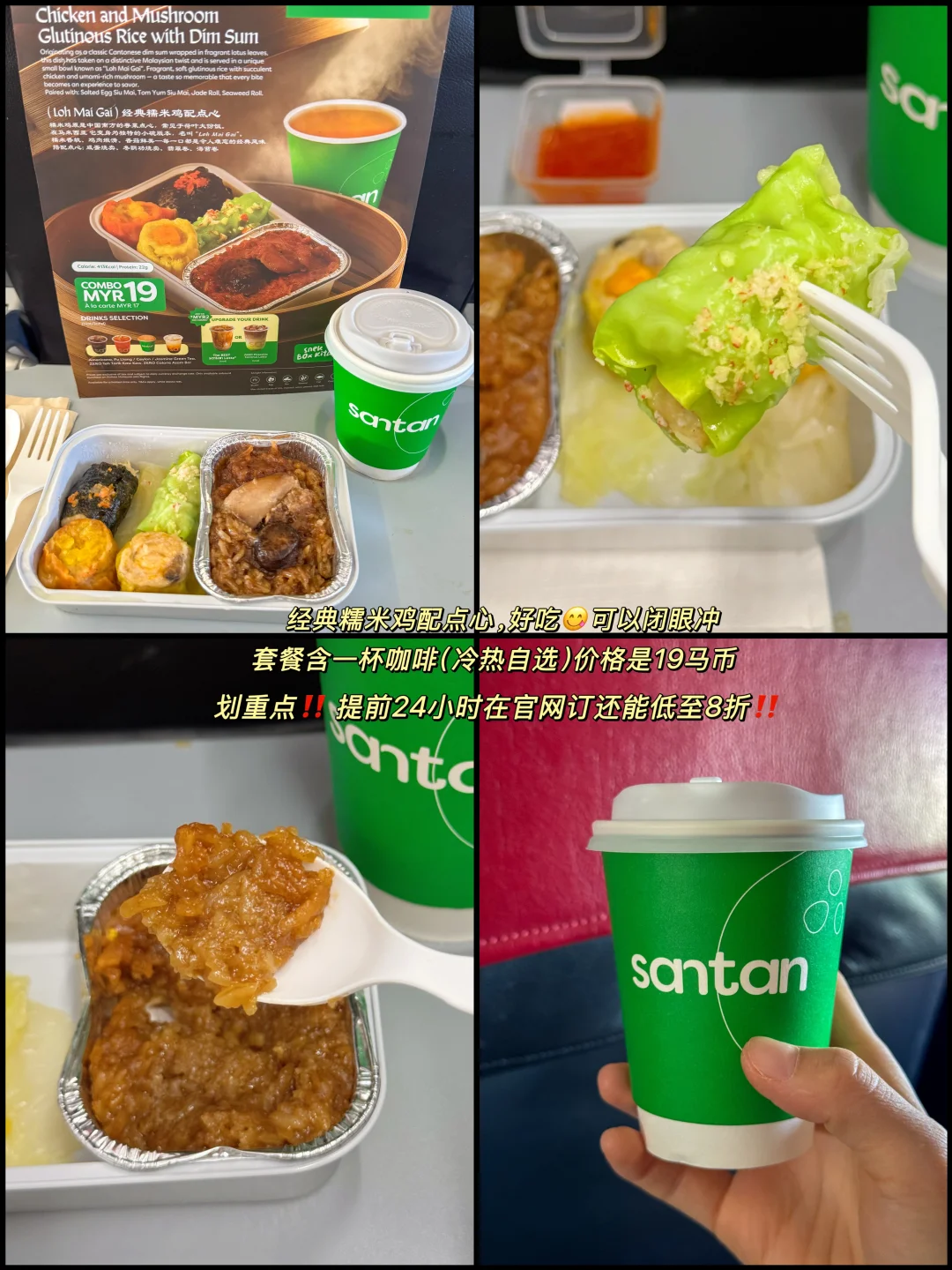 💺这次特意选了可以优先登机和快速下机的前舱座位,间距还比普通座宽很多,飞行舒适了许多;还预定了Santan的餐食,经典糯米鸡和点心很好吃,再搭一杯美式咖啡,5小时的飞行很快就过去了…提前24小时预定还有低至8折优惠