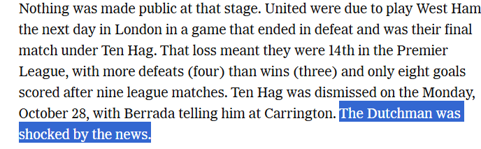 10月28日星期一,滕哈格被解雇,贝拉达在卡灵顿训练基地亲自告知了他这一消息。这位荷兰人对这个消息感到震惊。