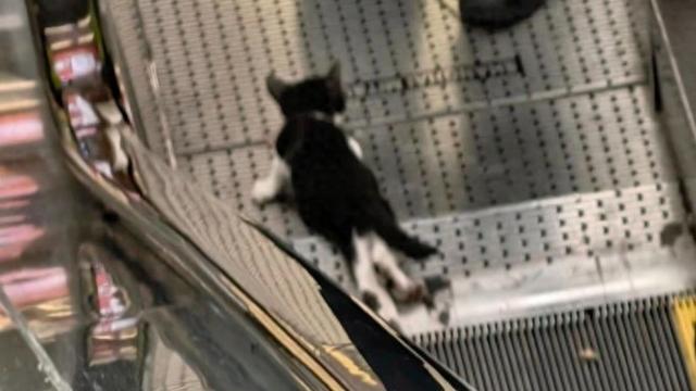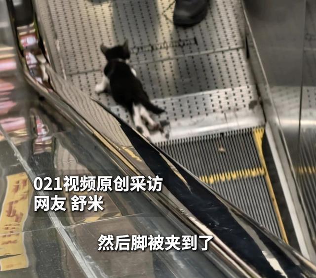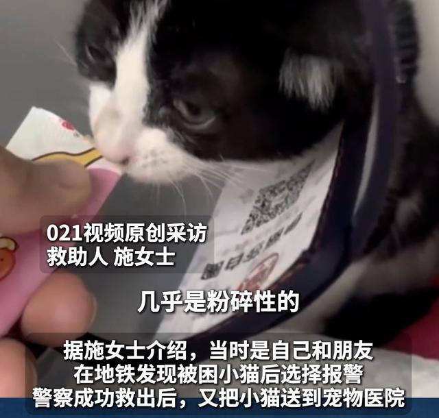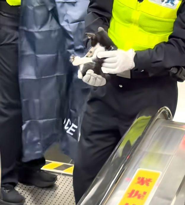 当日,人民广场站民警接到110报警后,第一时间做出反应。他们迅速联系车站维保人员,同时以最快的速度赶往现场。到达现场时,民警看到手扶电梯已被紧急按停,一只可怜的小猫正被困在电梯夹缝中间,它的两只脚被紧紧卡住,因疼痛和恐惧而不断挣扎。现场还能听到小猫微弱又急切的叫声,仿佛在向人们求救。
