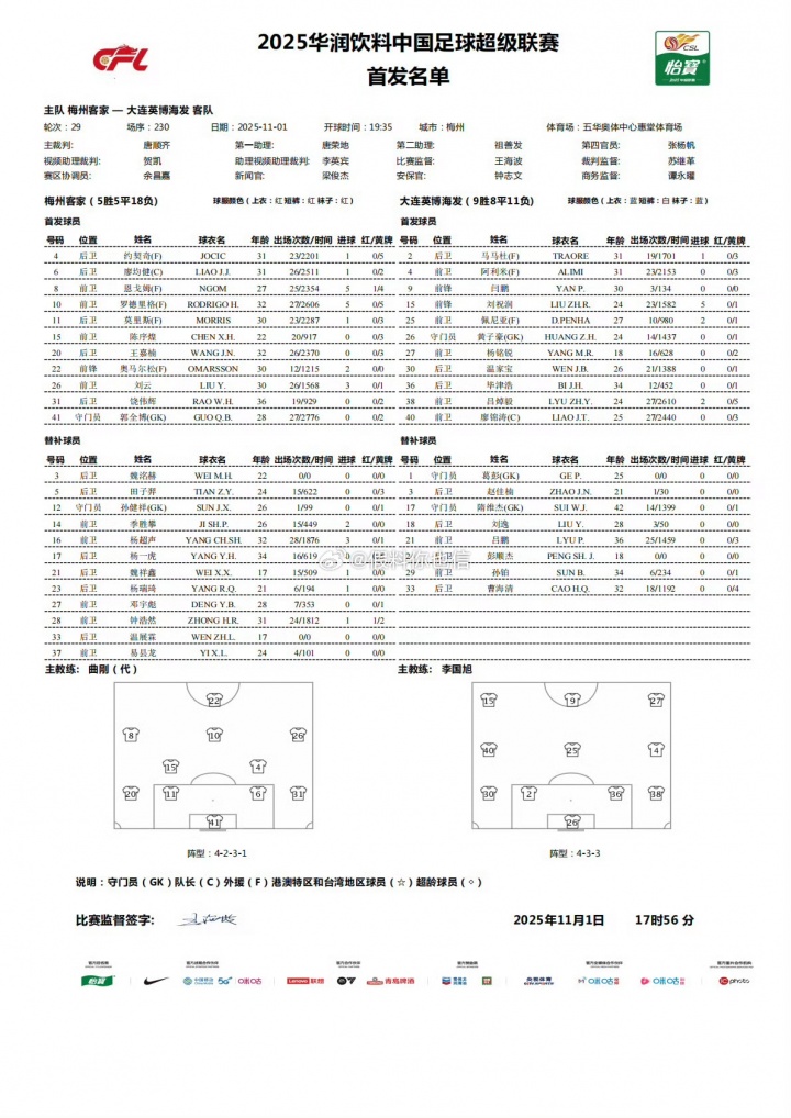直播吧11月01日讯北京时间19:35,中超第29轮,梅州客家主场迎战大连英博,赛前双方公布首发。