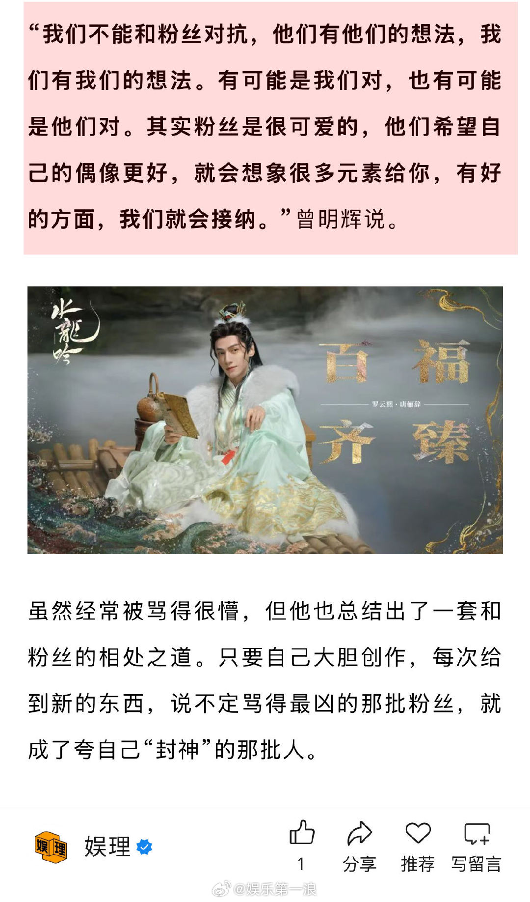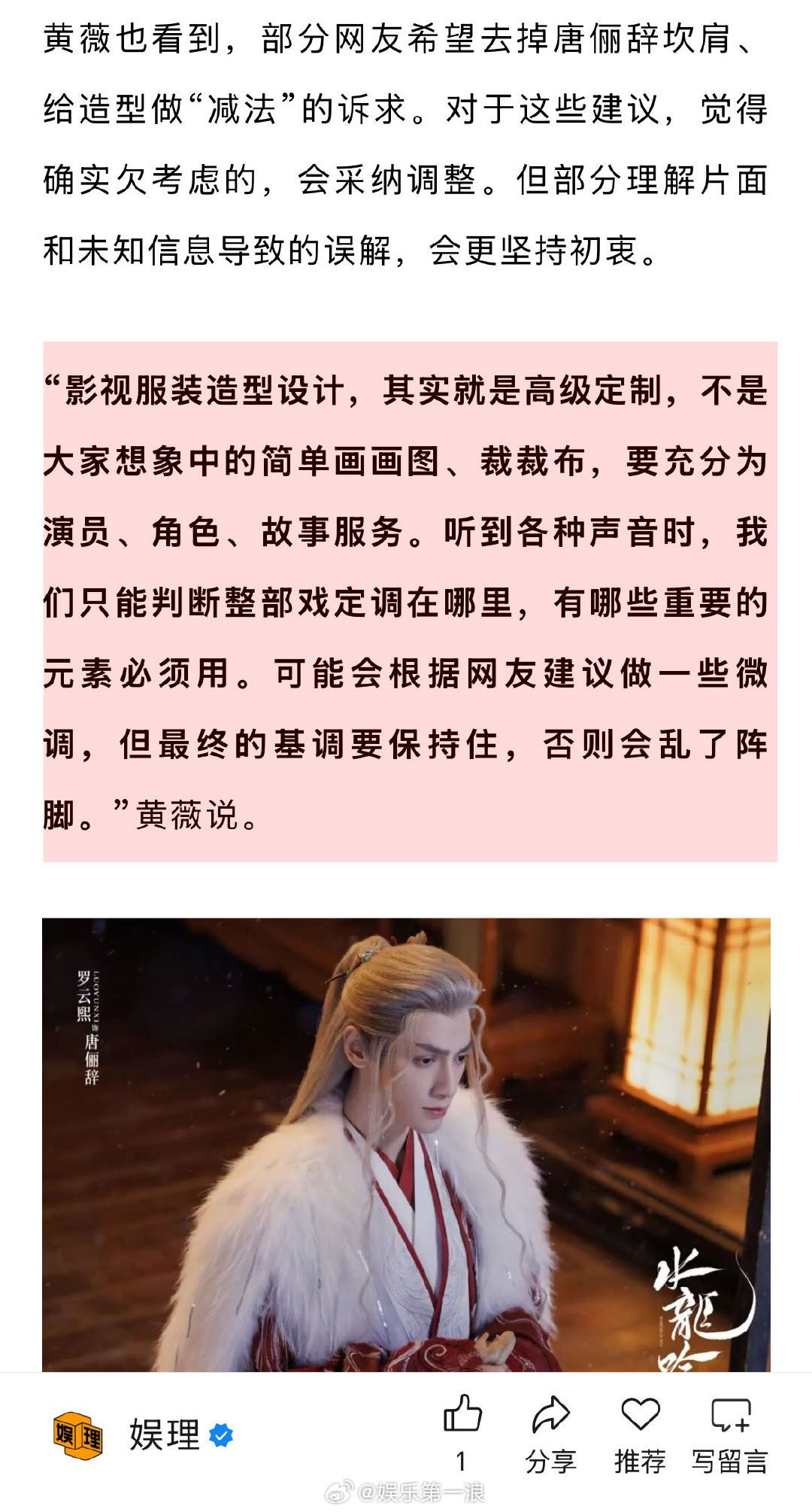 黄薇说罗云熙是天生拍古装的 黄薇曾明辉回应被网友监工 谈及因妆造引发的网络争议,《水龙吟》梳化指导曾明辉表示:我们不能和粉丝对抗,他们有他们的想法,我们有我们的想法。有可能是我们对,也有可能是他们对。其实粉丝是很可爱的,他们希望自己的偶像更好,就会想象很多元素给你,有好的方面,我们就会接纳…娱理独家↓