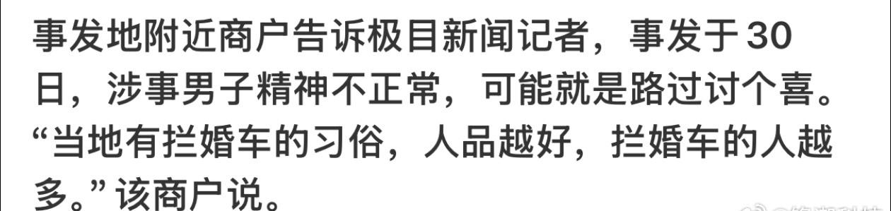 “当地有拦婚车的习俗,人品越好,拦婚车的人越多”