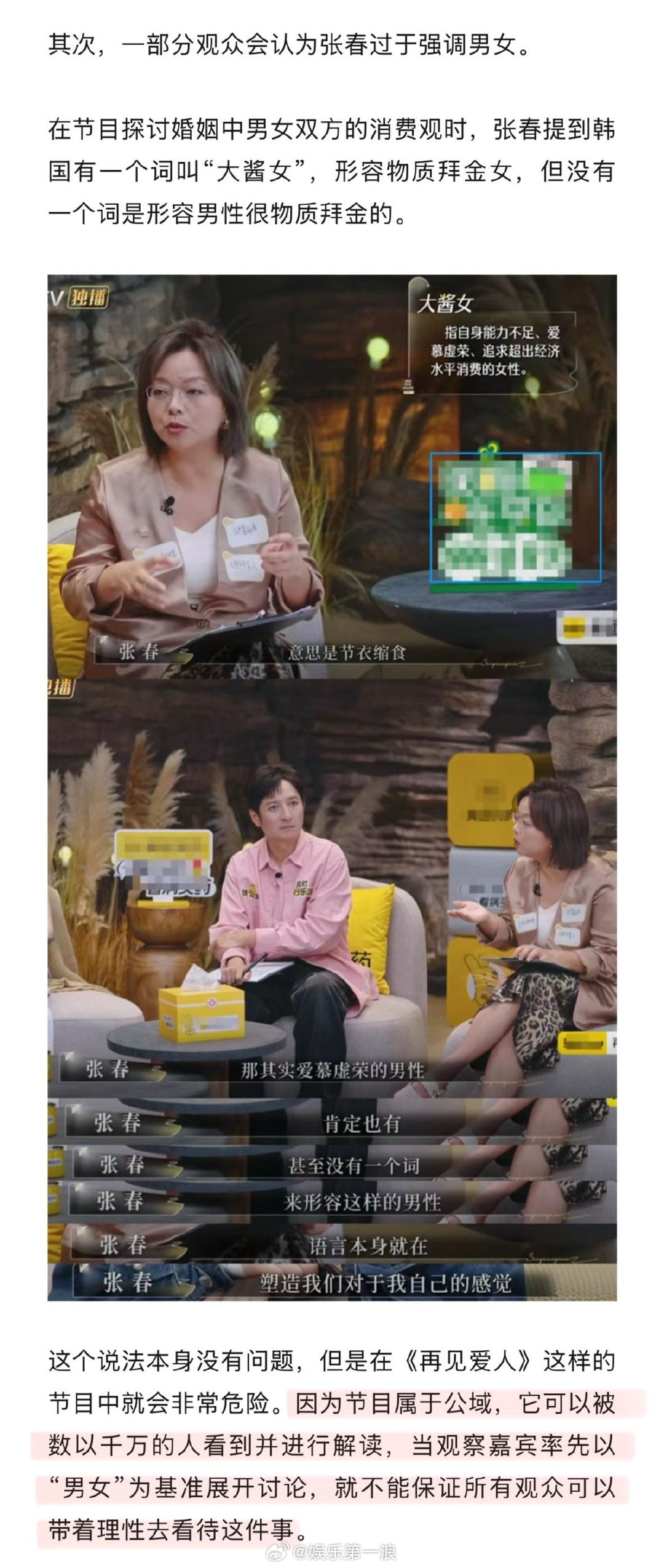 什么样的观察嘉宾适合再见爱人为什么张春在再见爱人水土不服 作为《再见爱人》的观察嘉宾,张春的发言引发不少争议,比如点评夫妻嘉宾时提及自身与“黄毛”的恋爱经历。网友对张春的审判,或许更多的是一份期待,期待从观察嘉宾那里得到专业解读,从而对婚姻有更深的理解。