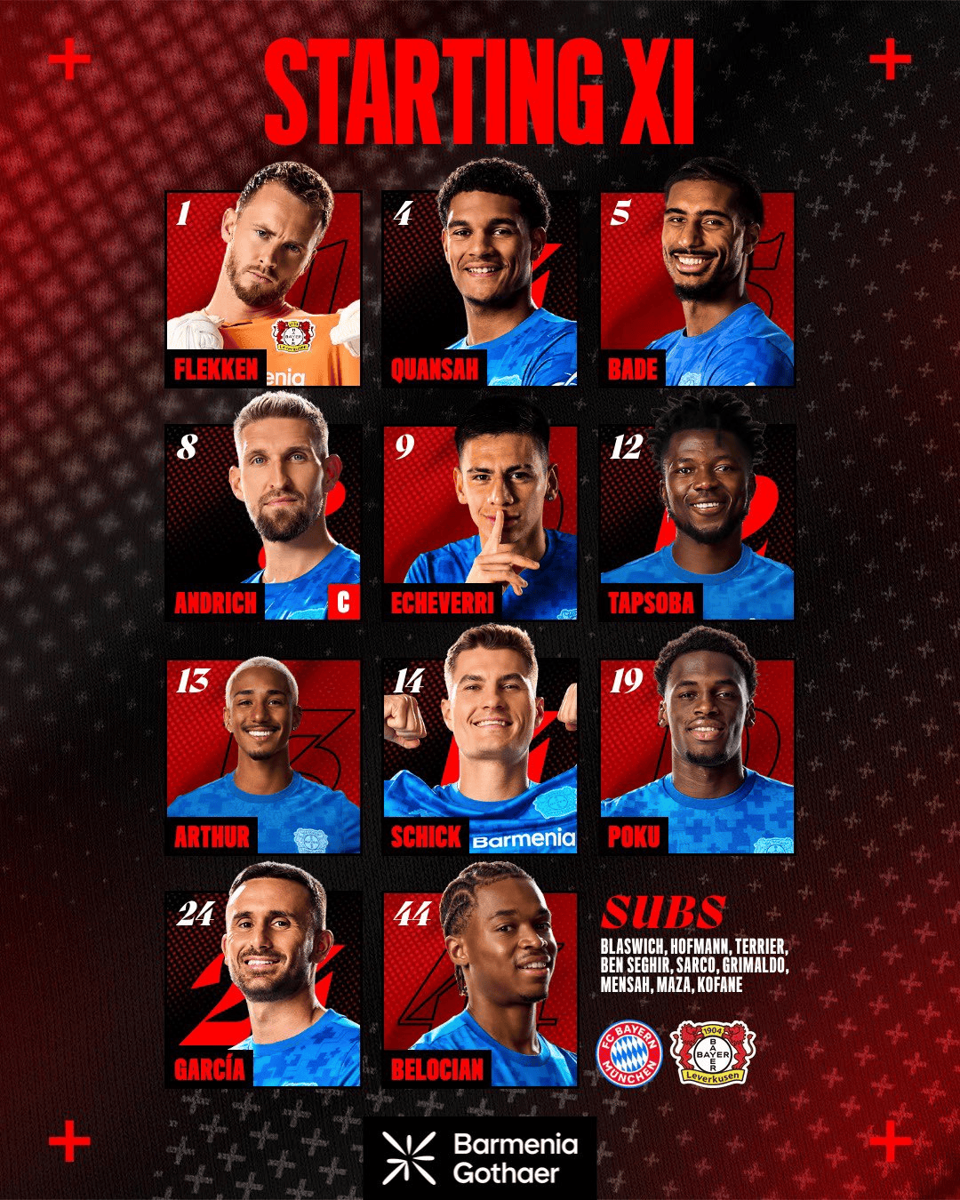 勒沃库森首发:1-弗莱肯、4-宽萨、5-巴代、12-塔普索巴、13-阿图尔、44-贝洛西安、24-阿莱克斯-加西亚、8-安德里希、19-波库、9-埃切维里、14-希克