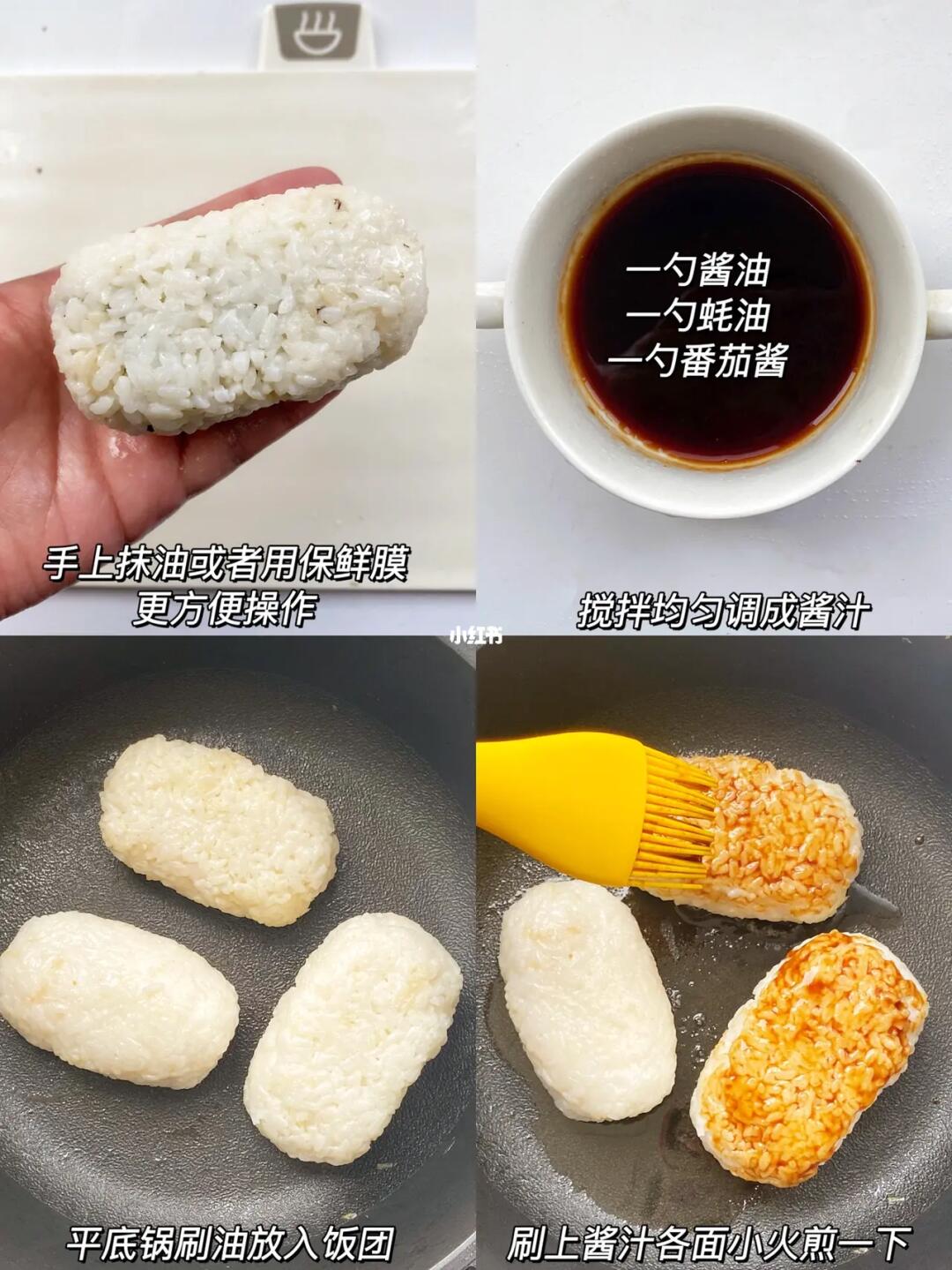 4.不粘锅刷油放入饭团,在饭团各个面刷上酱汁(一勺酱油、一勺蚝油、一勺番茄酱),小火各面煎一下就可以啦。