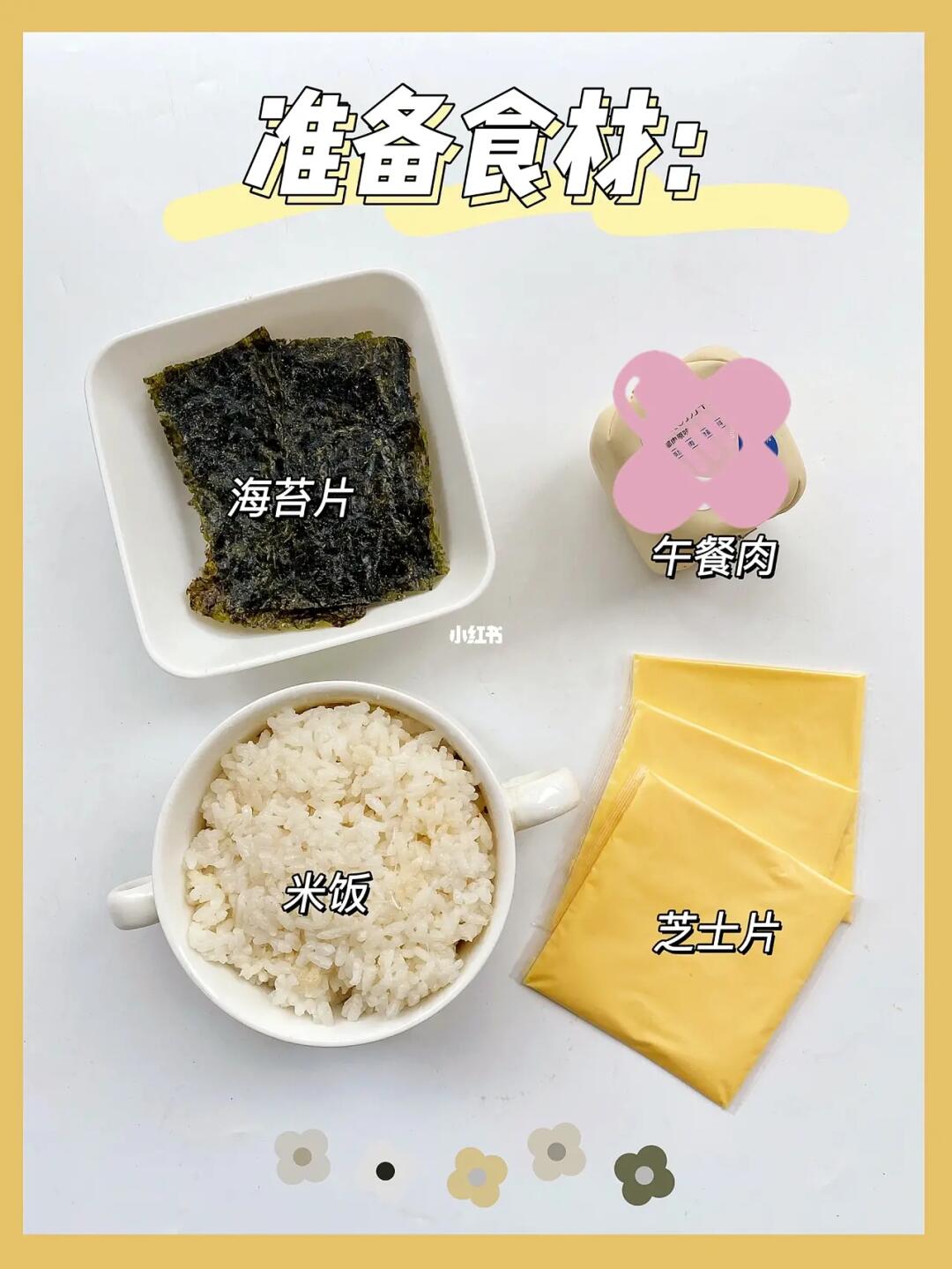 2.海苔片上放一片芝士,包入午餐肉,边缘用米粒黏住封口。