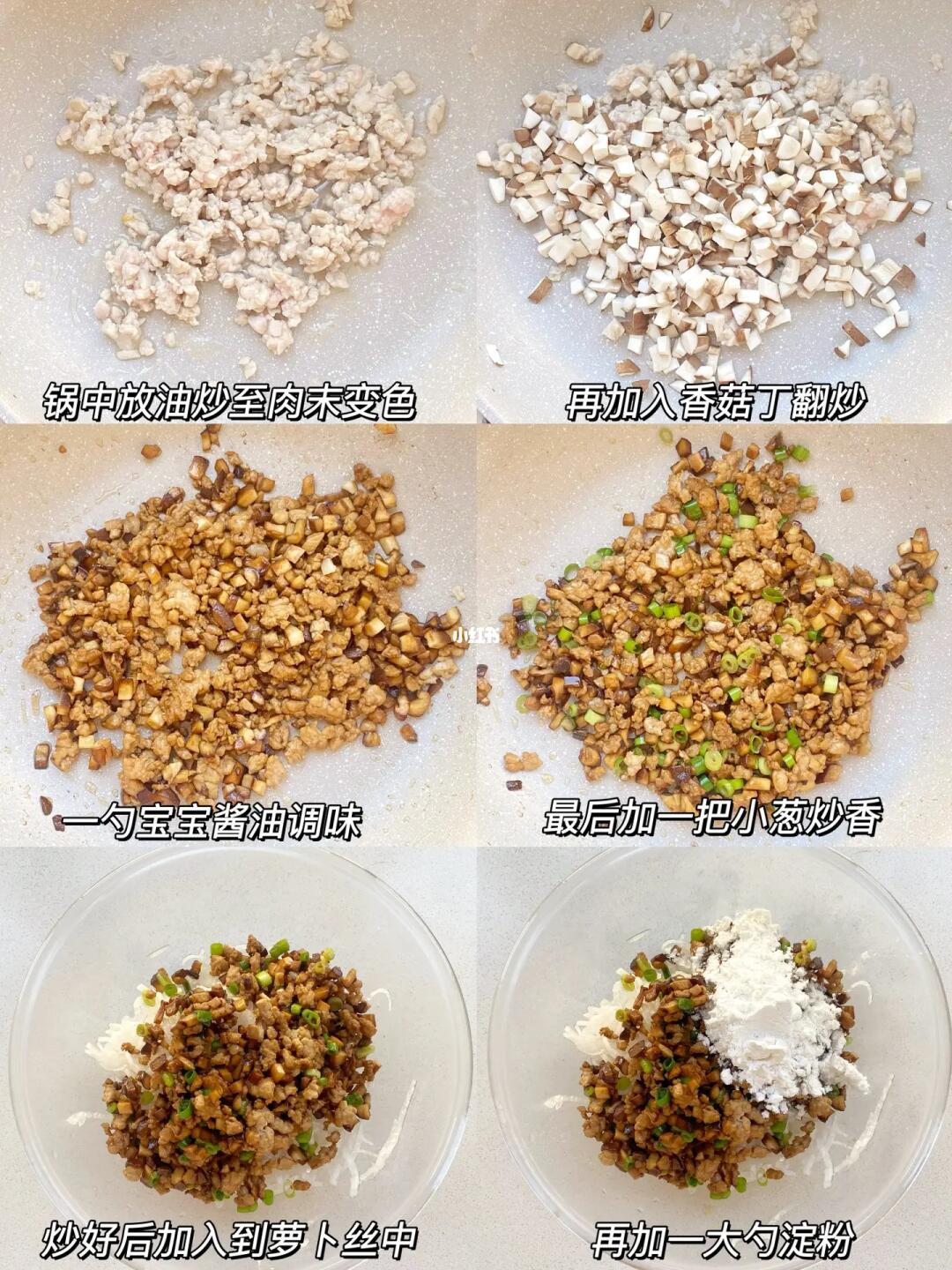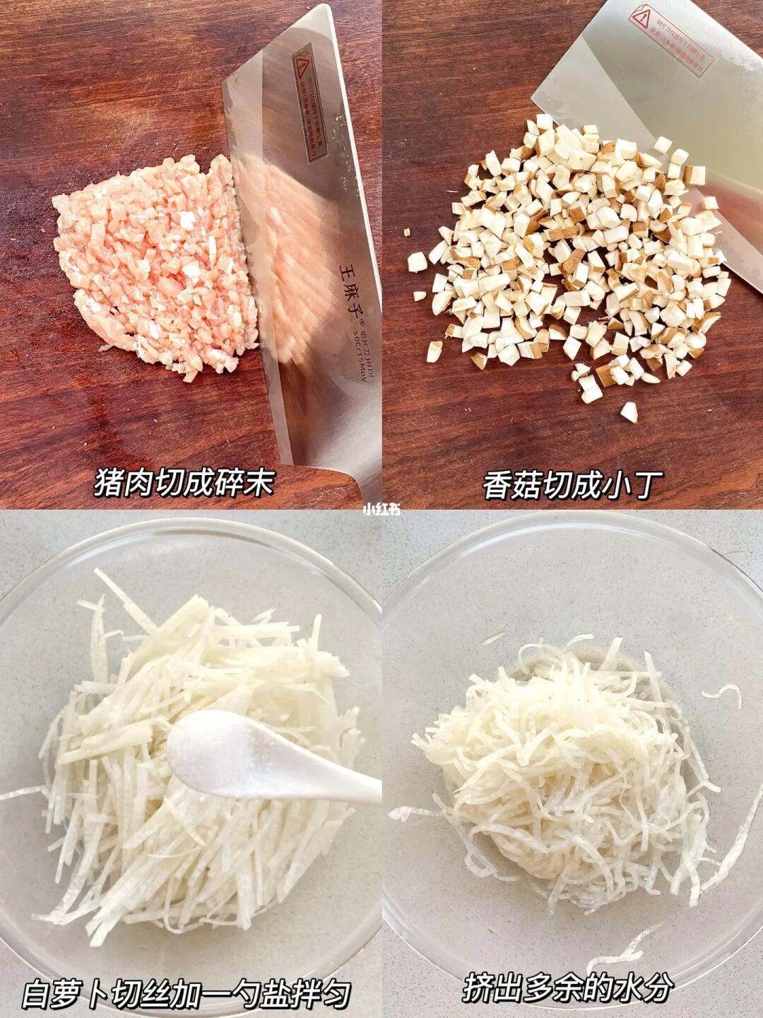 1⃣️猪肉切碎末,香菇切小丁,白萝卜切丝,也可以直接擦成丝。白萝卜加一勺盐拌匀,静止一会儿挤出多余的水分。