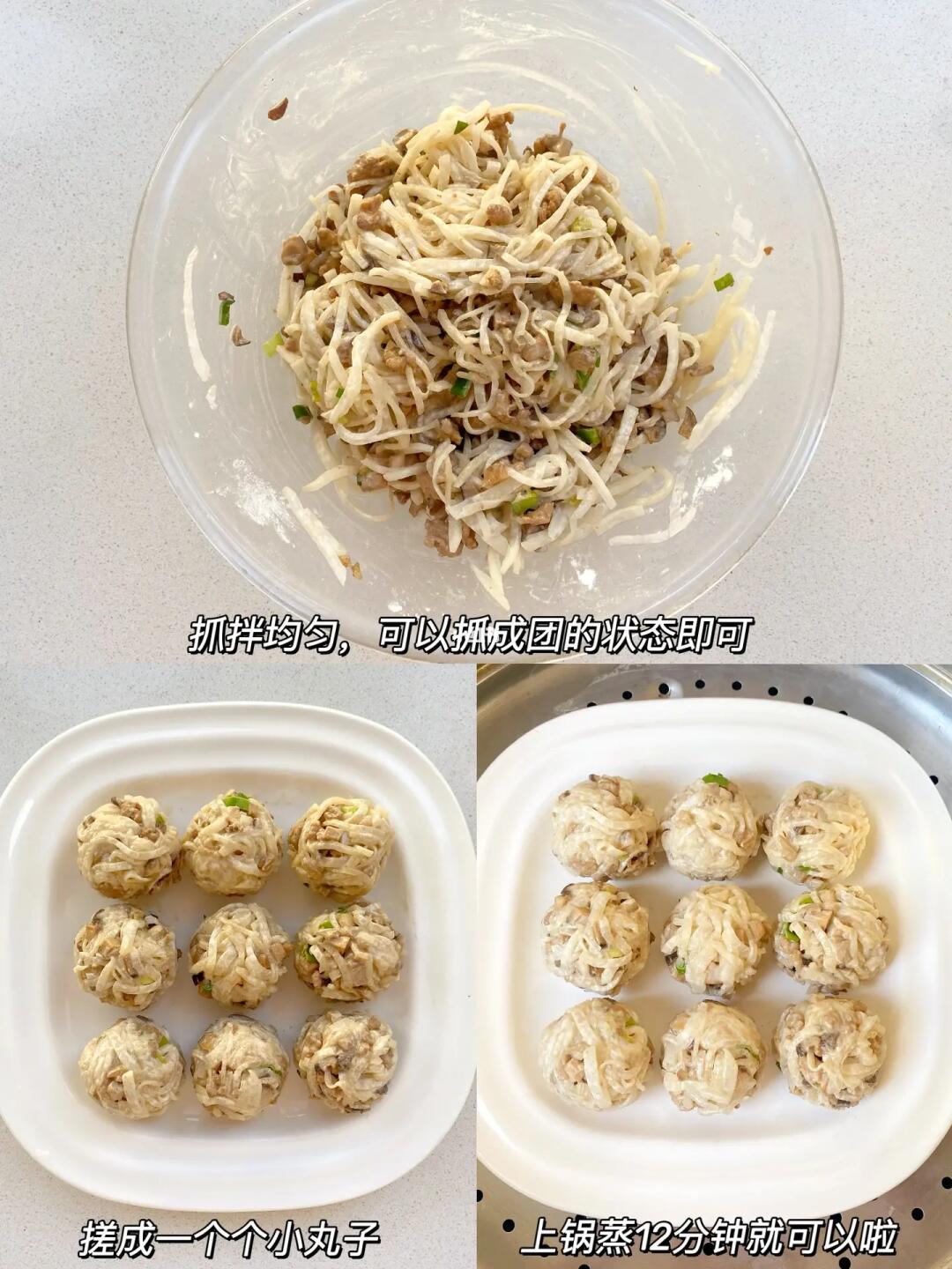 3⃣️炒好的馅料放入萝卜中,再加入一大勺玉米淀粉,抓拌均匀。手上抹油,搓成丸子,上锅蒸12分钟即可。
