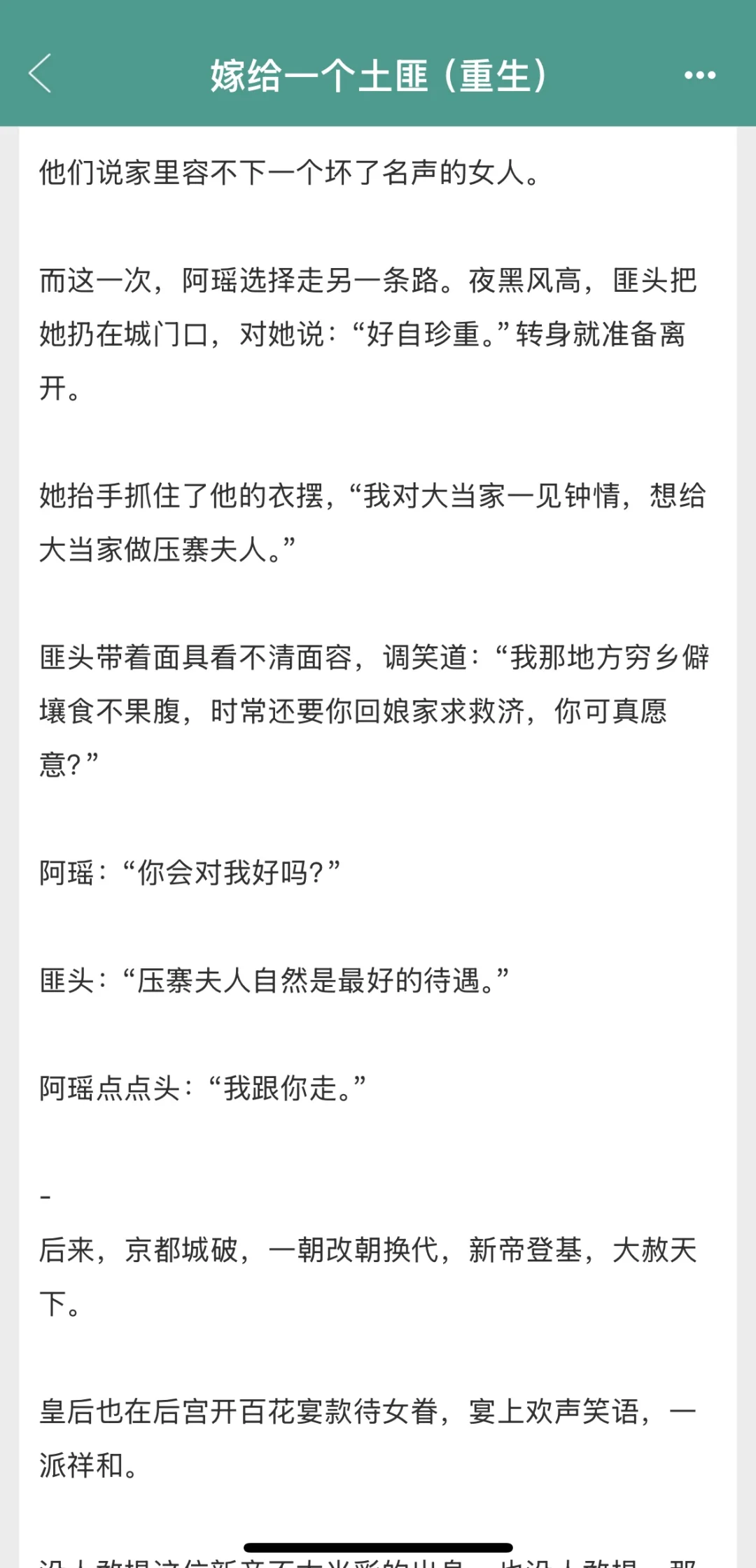 匪头带着面具看不清面容,调笑道:“我那地方穷乡僻壤食不果腹,时常还要你回娘家求救济,你可真愿意?”
