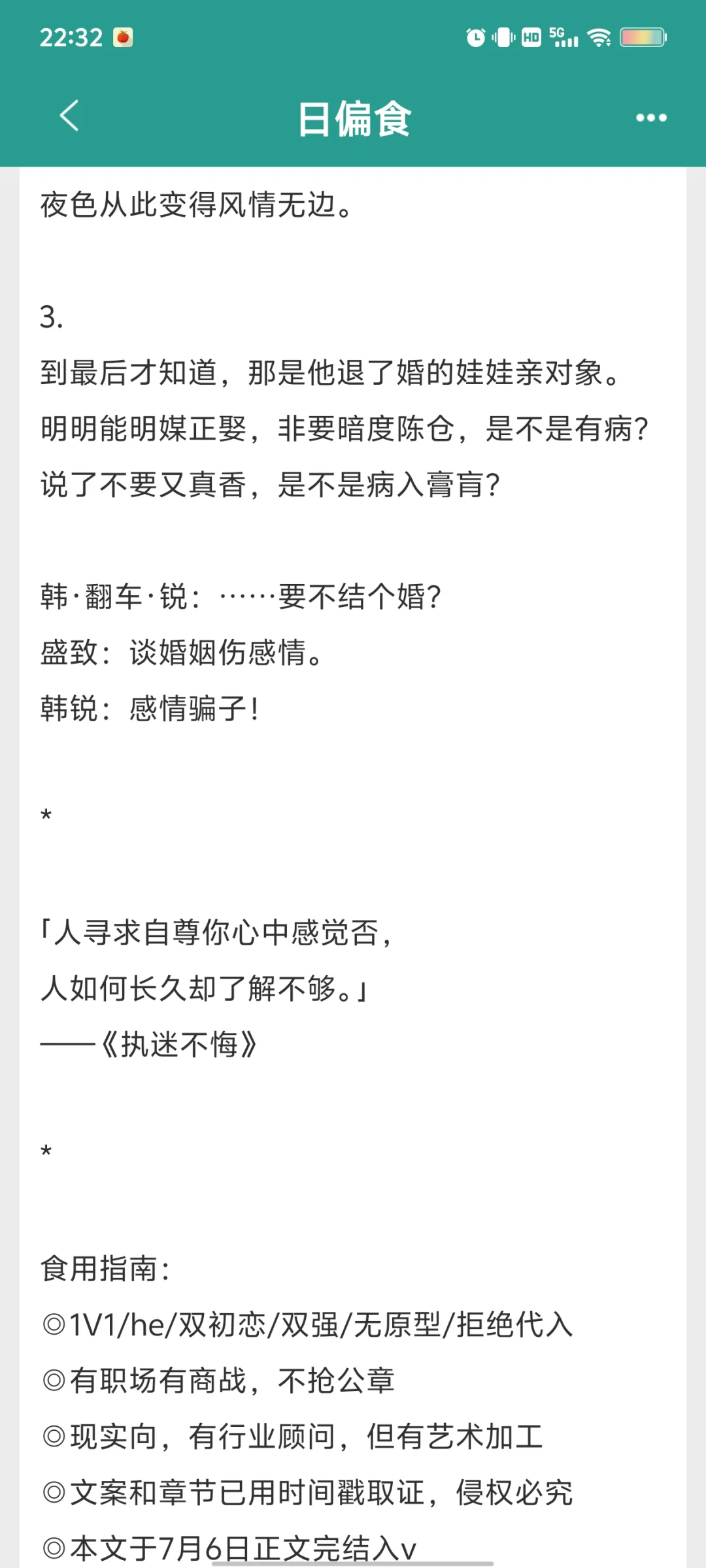 《日偏食》by在逃白桃🌞 23年完结的文,一共110章 作者是我超爱的在逃白桃👩‍💼,她的文笔真的很棒!故事超级甜,超级浪漫,而且超级反转,让你看得停不下来! 🌟活泼公关vs深情总裁 这是一个双初恋的故事,男主韩锐,是商界首屈一指的霸道总裁,女主盛致,是风情万种的公关。两人最初互不了解,却偶然结下不解之缘。 [红色心形R]情节跌宕起伏,充满了误会与挫折,但又不失温馨与浪漫。俩人在经历了一系列的考验后,终于坦诚相对,彼此敞开心扉,携手共度难关。 👏人物形象鲜明,性格各异。男主成熟稳重,对爱情忠贞不渝;女主魅力十足,事业心满满。两人一路上相互成长,相互扶持,最终he。 💥掉马文学,打脸真香 剧情超级精彩,男女主在经历了风风雨雨后,口嫌体正直的表达爱意,真的是打脸真香系列top!