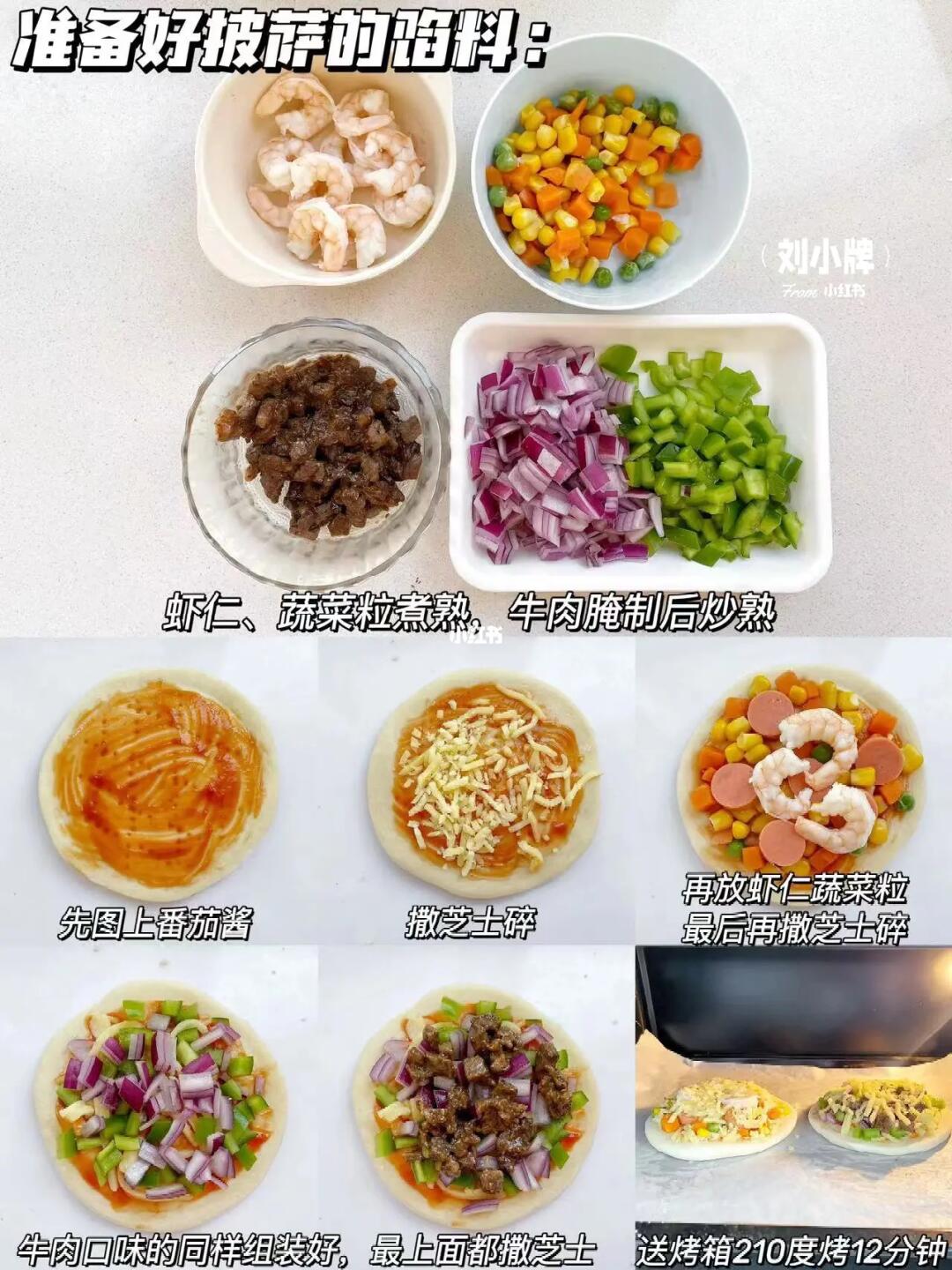 4⃣️烤好的饼状中间抹上番茄酱,撒上芝士碎放上杂蔬粒、虾、香肠、上面在撒上芝士碎。青椒牛肉口味的要现将牛肉腌制一下,再炒熟放在披萨上。