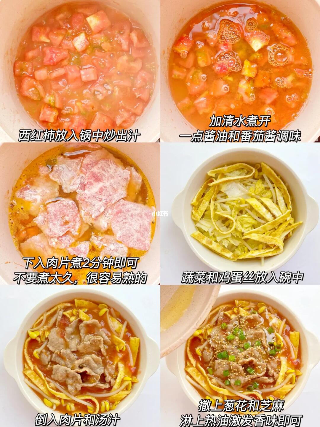 3⃣️再起锅放番茄炒出汁,加1勺番茄酱、1勺酱油调味,再加适量水煮开。水开后下入牛肉片煮大约2分钟就可以。碗底铺菜倒入煮好的牛肉,撒芝麻和葱花,淋热油激发香味。