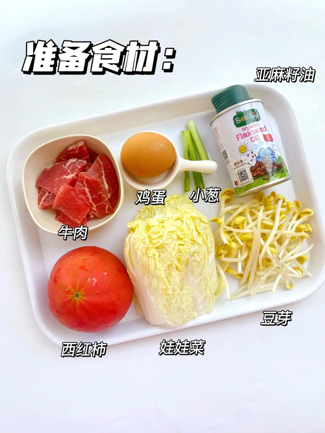 2⃣️锅中倒水水放娃娃菜和豆芽烫熟捞出。另起锅倒入亚麻籽油,倒入蛋液摊成蛋饼盛出切成条。
