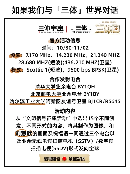刘慈欣老师发话啦!10.21三体日启动! 各位地球战友集合👉🏻是时候对三体文明喊出我们的心声了! 留下你想对三体世界说的话,就有机会被选中! 在10.30-11.2通过真实无线电向全球电台发射! 这波操作也太酷了吧!!! 三体粉丝这次真的吃得太好了[惊恐R] 投稿时间:10月21日起 发射时间:10月30日-11月2日 速来占领C位,让三体文明听到地球人的声音!!!