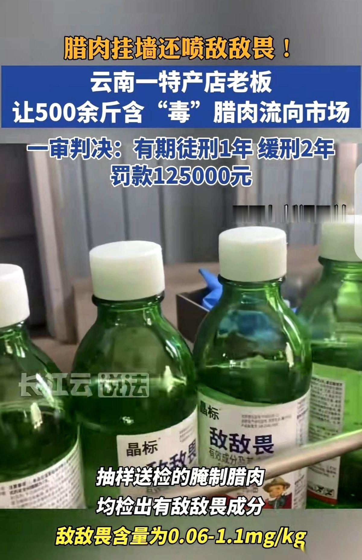 往腊肉上喷敌敌畏。两次。500多斤。 就因为夏天怕生虫,生意不好,一个老板就敢这么干。 最绝的是,他自己一口都不敢吃。 我都能想象到那个画面。 老板拿着兑了水的农药,对着一墙油亮的腊肉“滋滋滋”地喷,喷完还开着电风扇猛吹,想把那股贼味儿吹跑。 有客人上门,他还得点上香,拿空气清新剂盖味道。 看到有带孩子的来买,他自己都心虚得不敢抬头。 可钱一到手,立马就给自己洗脑:“没事儿,吃不坏人。” 呵呵。 吃不坏人?敌敌畏是什么,是能拌饭吃的东西吗?那是喝一口能要命的玩意儿。 最后怎么判的? 一年,缓刑两年。罚了12万5。 我真的眼前一黑。 这不就是在告诉所有人,你干吧,只要没当场吃死人,就没事,交点钱,连牢都不用坐。 犯罪成本低到令人发指。 最让我揪心的,是那卖出去的500多斤“毒腊肉”。 它们到底流向了谁家的餐桌?被哪些老人小孩吃进了肚子?这个问题,谁来回答? 食品安全这根弦,如果法律都不能给它绷紧,那我们普通人,除了赌命,还能怎么办?