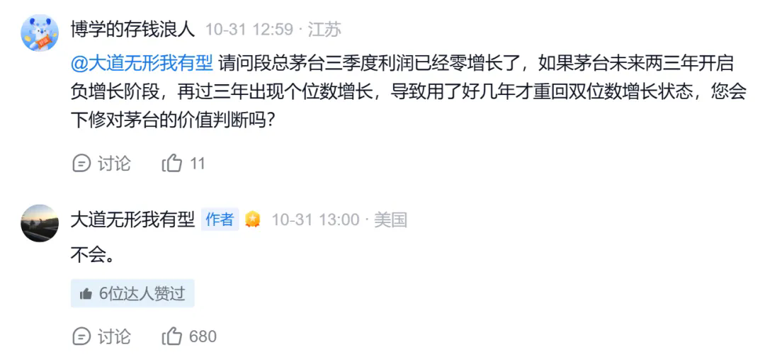 对于该三季报,有网友在雪球上向段永平提问,“请问段总茅台三季度利润已经零增长了,如果茅台未来两三年开启负增长阶段,再过三年出现个位数增长,导致用了好几年才重回双位数增长状态,您会下修对茅台的价值判断吗?”