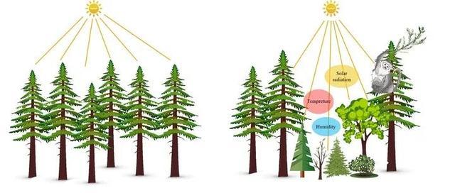 △没有滇金丝猴的区域,林窗较小,植物群落单一(左图);滇金丝猴活动的区域,因其取食等行为折断林冠树枝,增大林窗,改变林下气候条件,增加了生物多样性且优化了森林结构(右图)。