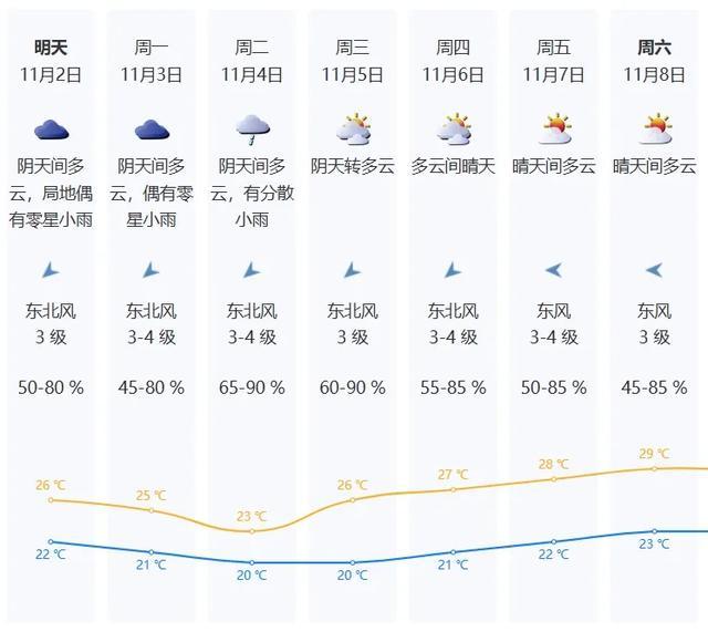 11月2日阴天间多云,局地偶有零星小雨,气温22-26℃。