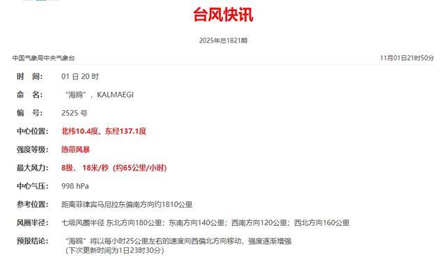 2025年第25号台风“海鸥”(热带风暴级,英文名:Kalmaegi)于11月01日20时在美国关岛西南偏西方向915公里,菲律宾马尼拉东南偏东方向1807公里洋面上生成,北纬10.3°、东经137°,中心风力8级(18米/秒),中心气压1000hPa。