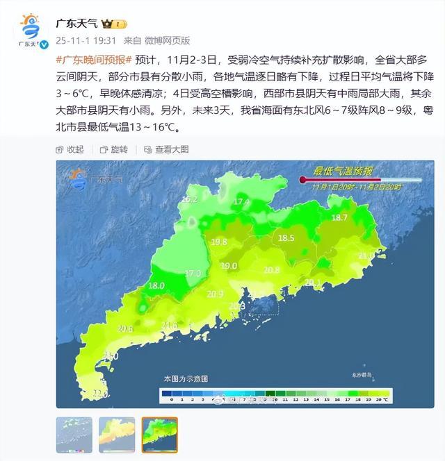 11月2日,南部市县和粤北市县多云到阴天,有分散性零星小雨,其余市县多云间阴天局部有小雨。最低气温:粤西、粤东和珠江三角洲市县19~22℃,其余市县15~18℃;