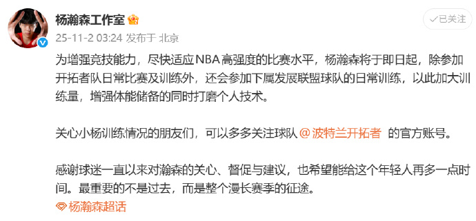 杨瀚森方说希望多给点时间 开拓者官宣将下放至发展联盟,发布声明:感谢球迷一直以来对瀚森的关心、督促与建议,也希望能给这个年轻人再多一点时间。最重要的不是过去,而是整个漫长赛季的征途。