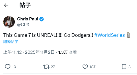 快船球员克里斯-保罗发推称赞:“抢七大战太疯狂了,洛杉矶道奇加油。”
