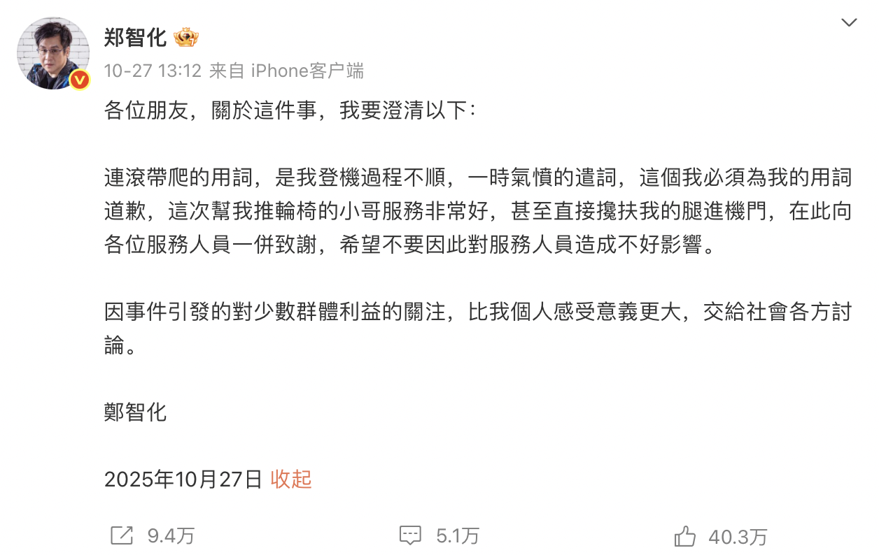10月25日下午,歌手郑智化发微博控诉深圳机场残疾人服务缺失问题。他在微博里表示,登机的时候廊桥和登机口的空隙让他的轮椅无法通过,当时工作人员冷眼看着他“连滚带爬进飞机”,这样的表述引发了不少网友的关注和讨论。