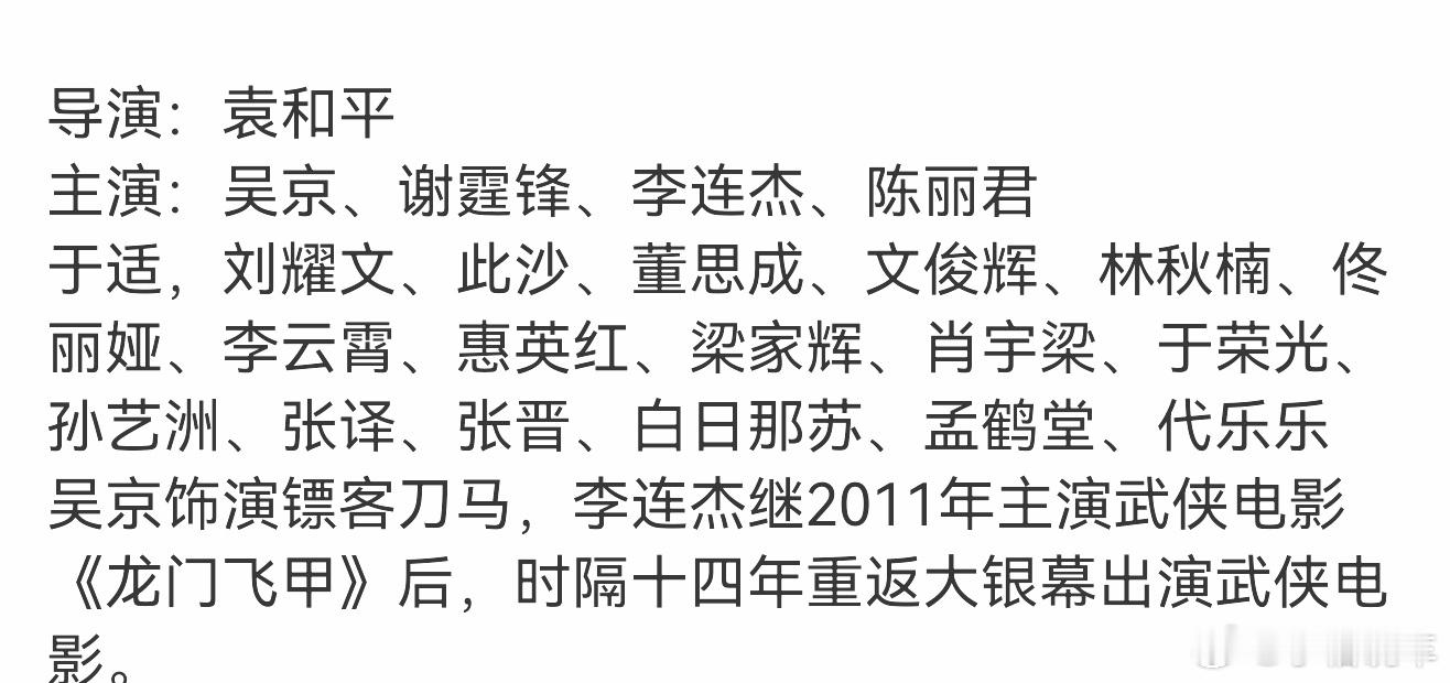 镖人袁和平导演,吴京监制和主演,谢霆锋、李连杰、于适等领衔主演,讲刀马在躲避朝廷