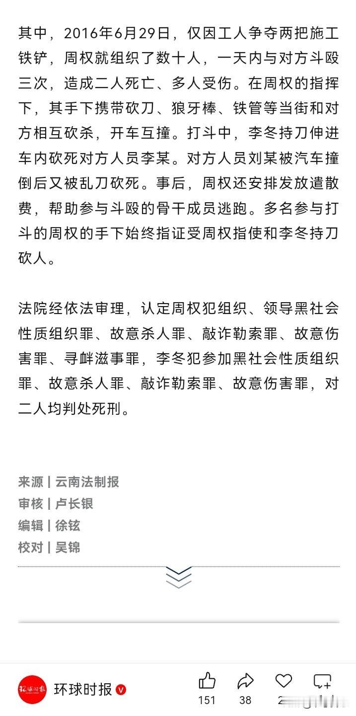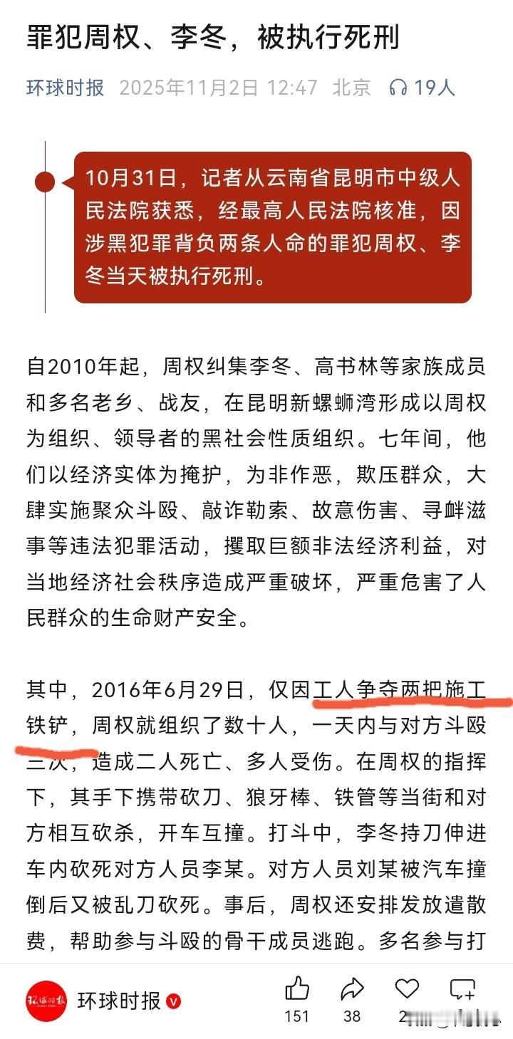 还记得之前有《一个馒头引发的血案》,现实中,看到了在昆明,一个黑帮因为2把施工铁铲引发2条人命的血案,最终被打掉,2个黑老大被判死刑,已经执行死刑! 原来,2010年起,周权纠集李冬、高书林等人,在昆明新螺蛳湾形成以周权为组织、领导者的黑社会性质组织。七年间(那么也就是2010-2017年左右吧),他们以经济实体为掩护,为非作恶,欺压群众,大肆实施聚众斗殴、敲诈勒索、故意伤害、寻衅滋事等违法犯罪活动,攫取巨额非法经济利益,危害巨大…… 但是,上天要让一个人灭亡,必先让他疯狂。2016年6月29日,仅因工人争夺2把施工铁铲,周权就组织了数十人,一天内与对方斗殴3次,造成2人死亡、多人受伤。 由此可见,事情的起因是“工人争夺2把施工铁铲”,尚不知和他们斗殴的是哪个组织,但也可以知道都不是善茬。 周权等人犯下的事情肯定不少,之前的不知道是如何处理。但是,人命关天,2个人的死亡,最终导致了周权、李冬被抓获,并判死刑,而且已经被执行(所以,他们也不可能像孙小果那样,再偷生几十年)! 之前看的一些警匪片,打打杀杀,为了洗车的地盘;如今,昆明的2条人命案,起因是争夺2把施工铁铲…… 其实,这类型好勇斗狠之人,即使今天不为争夺2把铁铲,明天也会为了争1个垃圾桶、1个停车位而大打出手,并最终引发命案,从而覆灭…… 或许,莫欺人善,作恶自有天收吧! 头号创作者激励计划 书慰我心 资料来源:《环球时报》2025年11月2日《罪犯周权、李冬,被执行死刑》