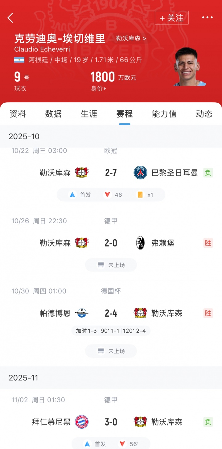 本场比赛,勒沃库森19岁中场埃切维里首发出战56分钟被换下,埃切维里33次触球26次传球,传球成功率92.3%,1次拦截,3次地面对抗均失败。