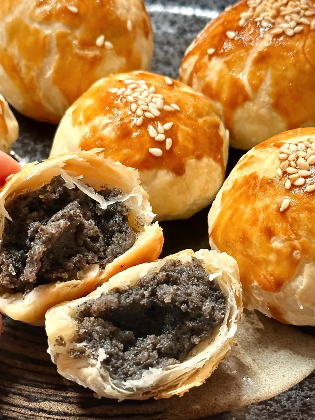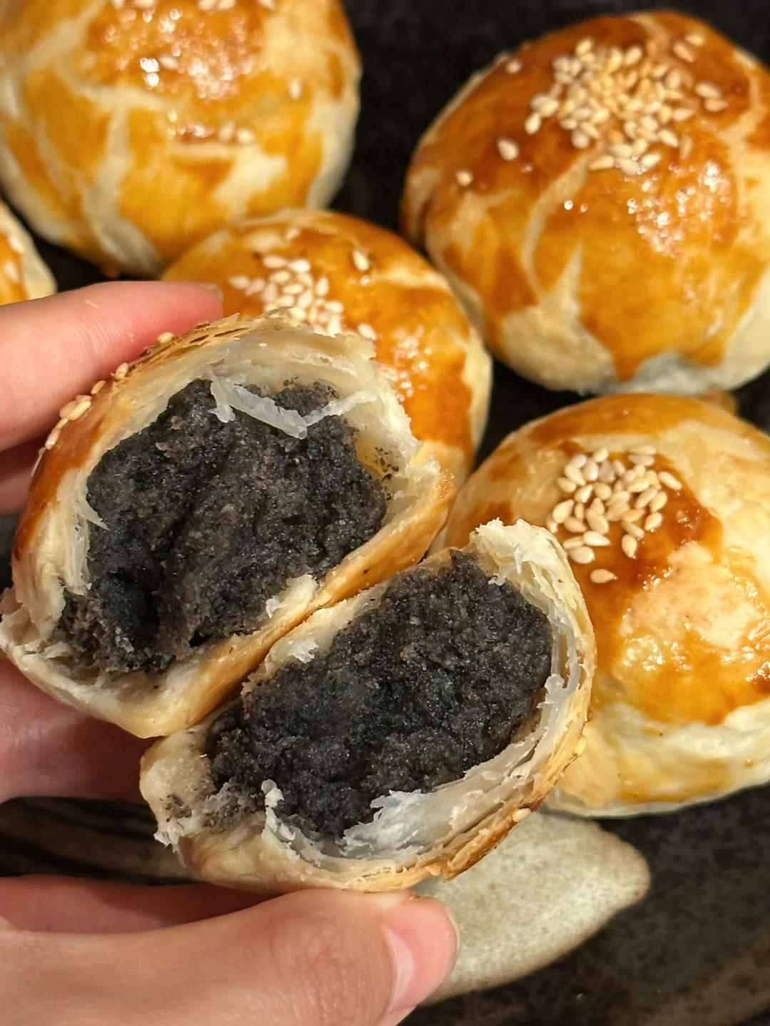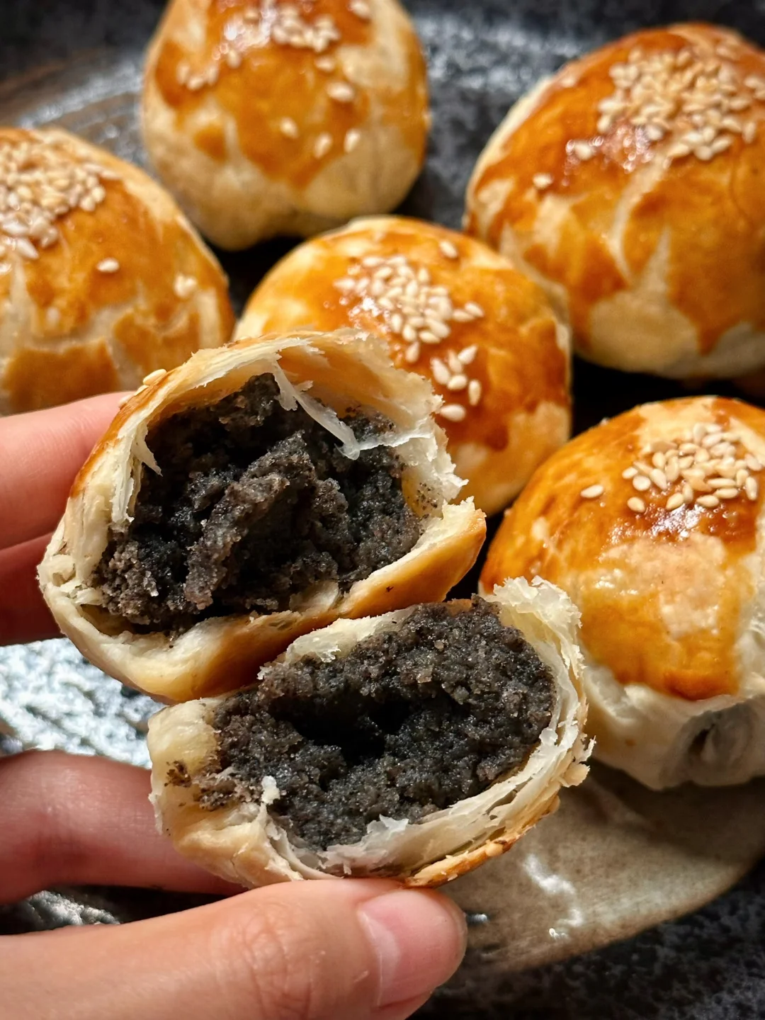 出炉趁热掰开,轻薄的酥皮底下是满满的芝麻馅,这乌黑油润的色泽,看着就觉得头发蹭蹭长😂